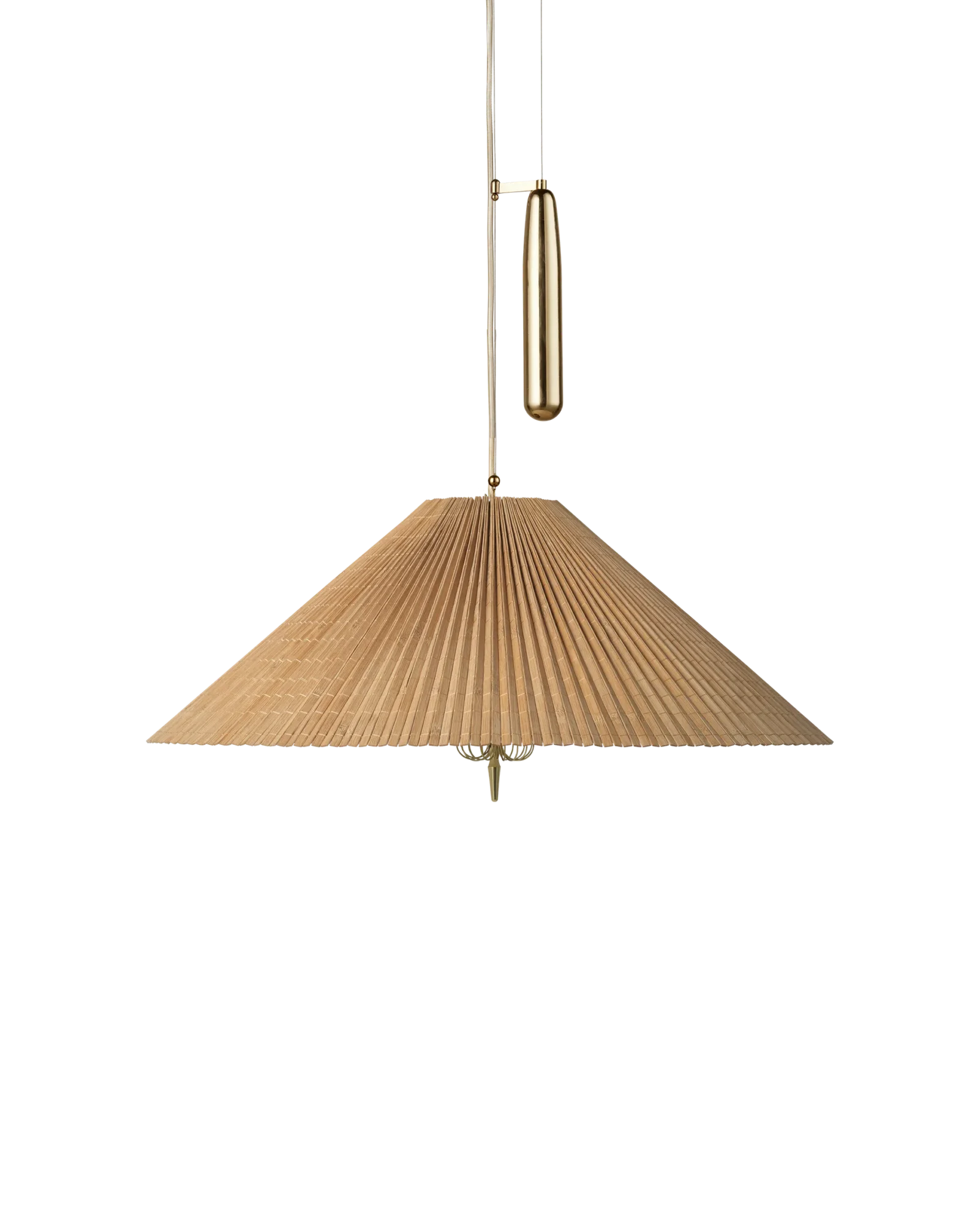 The conical shade is meticulously handcrafted from bamboo slats, hand-sewn into a pleated mat and carefully fastened to a delicate wire frame. A linen liner is set between the bamboo layers, directing light downward while allowing a warm, diffused glow to filter gently through the slats and upward into the surrounding space. This layered construction produces a soft interplay of light and shadow, enriching the atmosphere without glare.