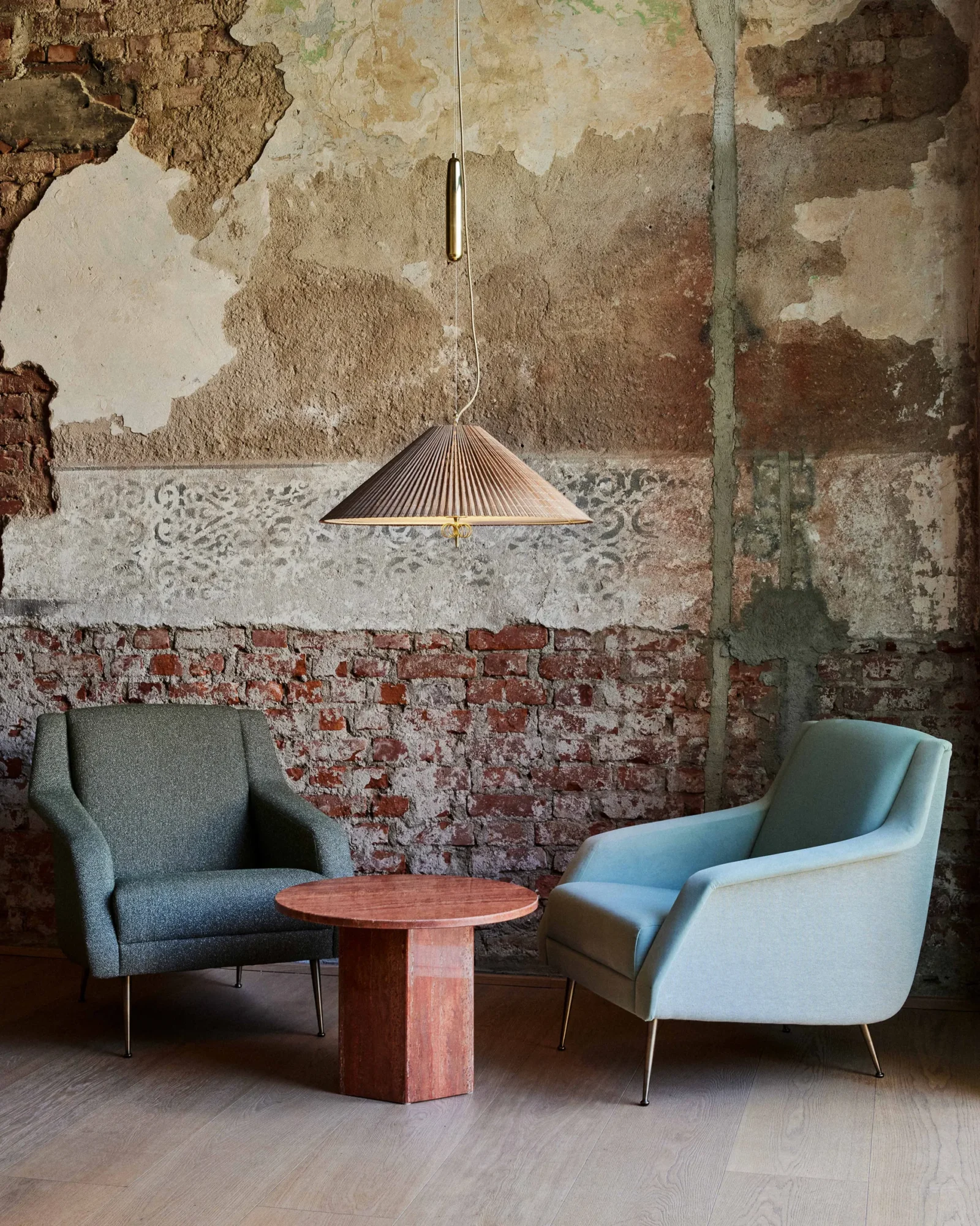 The A1972 Pendant exemplifies Paavo Tynell’s poetic approach to materiality, pairing natural textures with refined brass detailing in a design that feels both organic and enduring. Created during the height of his mid-century practice, the pendant reflects Tynell’s sensitivity to craftsmanship and his gift for transforming humble materials into luminous works of art.