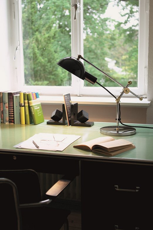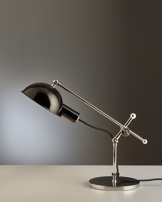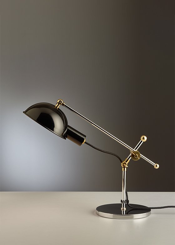 This table lamp has become a coveted designer object and the perfect reflection of Bauhaus design with its basic geometric shapes and asymmetrical elements. It was created in 1927, but its designer is sadly unknown. Its striking hemisphere is made of polished aluminium that partially covers the opal glass. Another spherical element connects the light fixture to the standpipe, which leads to a black painted metal base and the switch. The heavy baseplate keeps the sculptural object nice and stable. In the 1920s, there was a series of similar desk lamps that could all be moved or rotated at various function points. All kinds of models were created by designers like Christian Dell, Ferdinand Kramer, Marianne Brandt and Eduard-Wilfrid Buquet. When Tecnolumen discovered the original version of the lamp in Sweden, they weren’t able to determine its surface material, so they chrome-plated the surfaces of the rods and baseplate, painted the reflector black and left the function points in brass or chrome. Each lamp is numbered consecutively and bears the TECNOLUMEN signet.