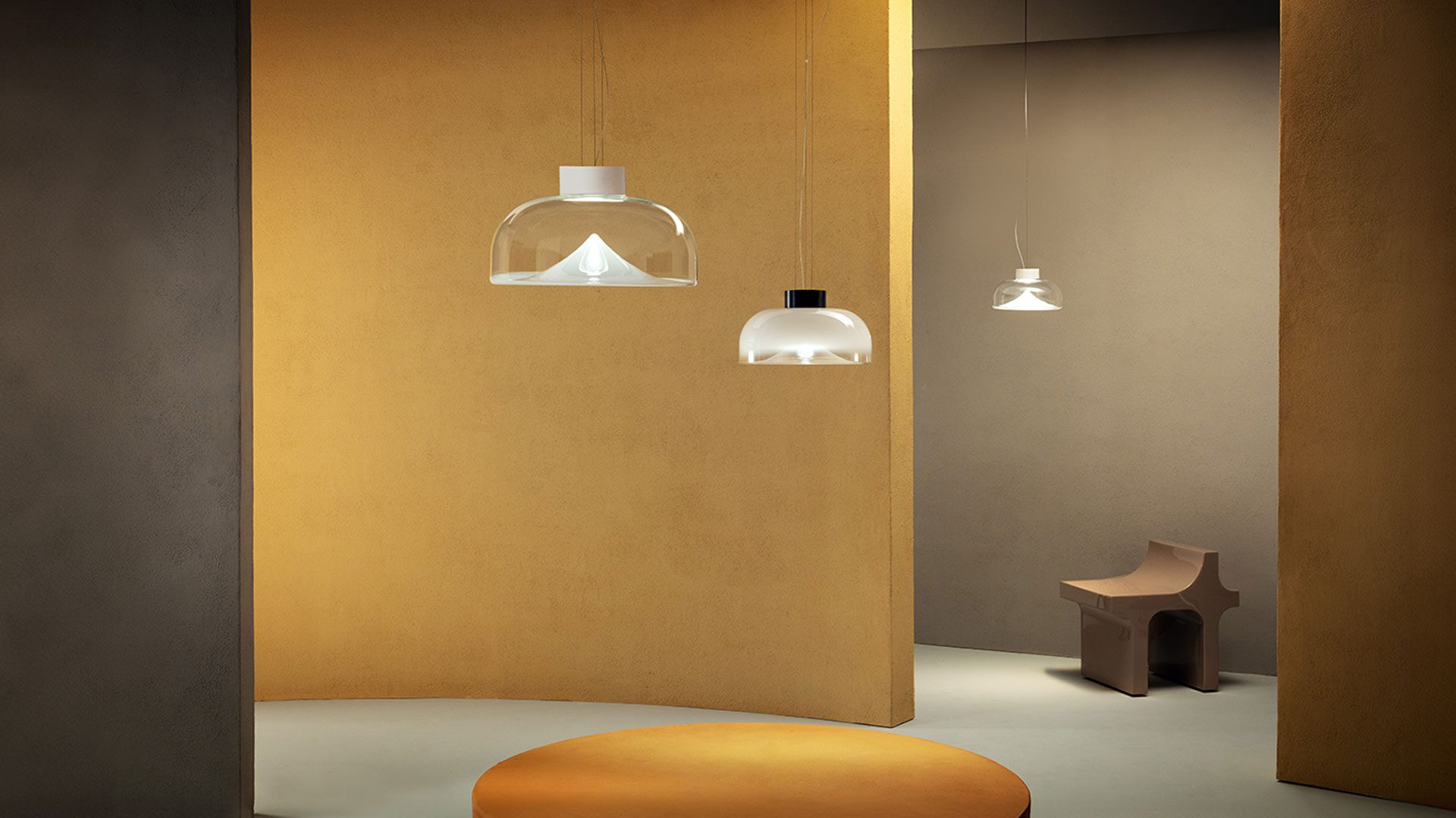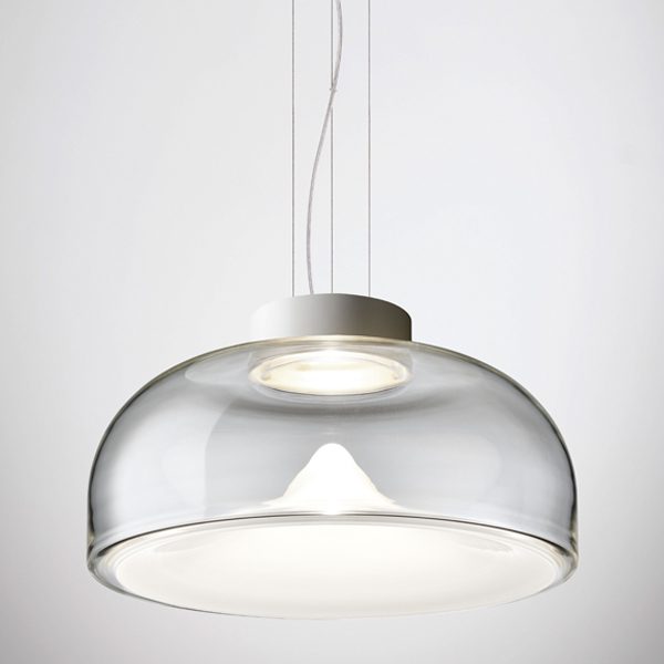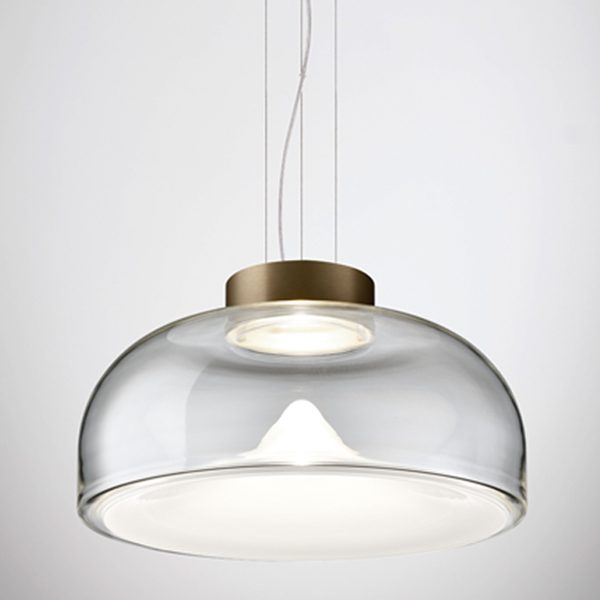 Aella is the ‘whirlwind’, embodied by the dynamic movement captured in its handblown glass diffuser. Emanating from the single point, an evanescent light cone grows to create sinuous patterns and harmonic reflections. Designed in 1968 by Toso and Massari, this table and suspension lamps collection incorporates the essential and timeless design principles, characteristic of Leucos’ products. Available in two sizes for the table and suspension versions (Ø30 and Ø54 cm - Ø11 3/4” and Ø21 1/4”) with transparent or smoked glass diffuser. Structure in 4 finishes for the Ø54 cm version (glossy chrome, glossy warm white, vintage brass, matt gunmetal) and 3 finishes for the Ø30 cm version (glossy chrome, glossy warm white and glossy gunmetal) with matching canopy in the same color for the pendant version. The LED light source (Aella S 54 e Aella T 54) can be easily replaced by the user.