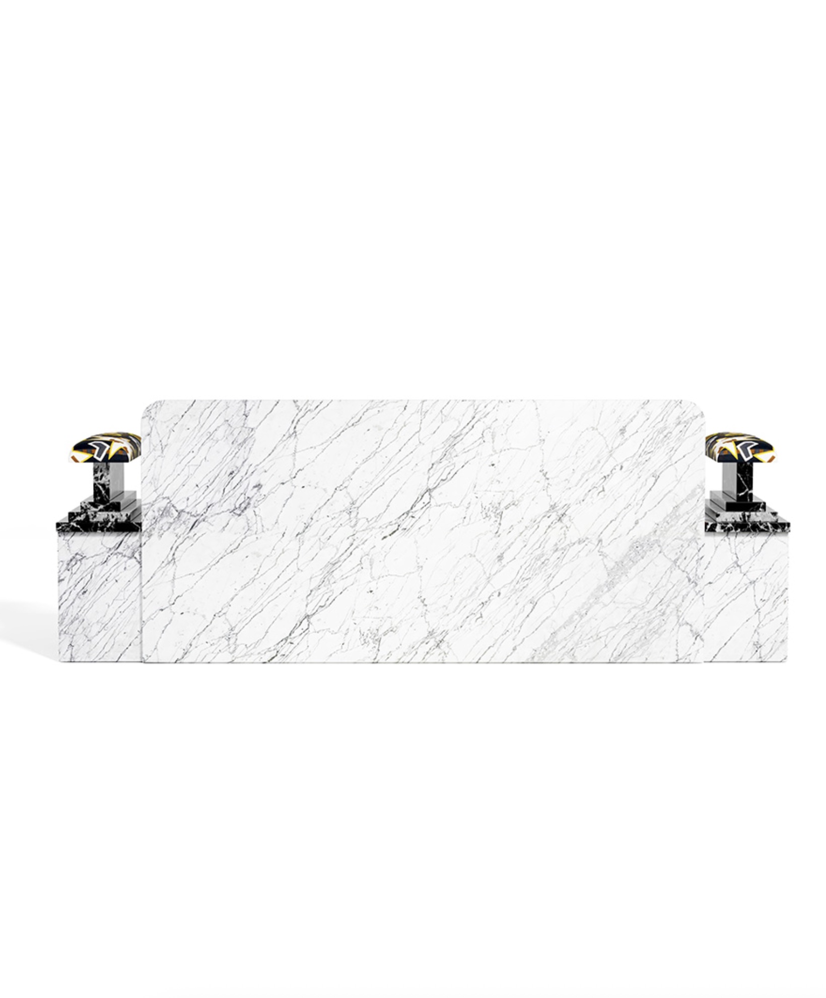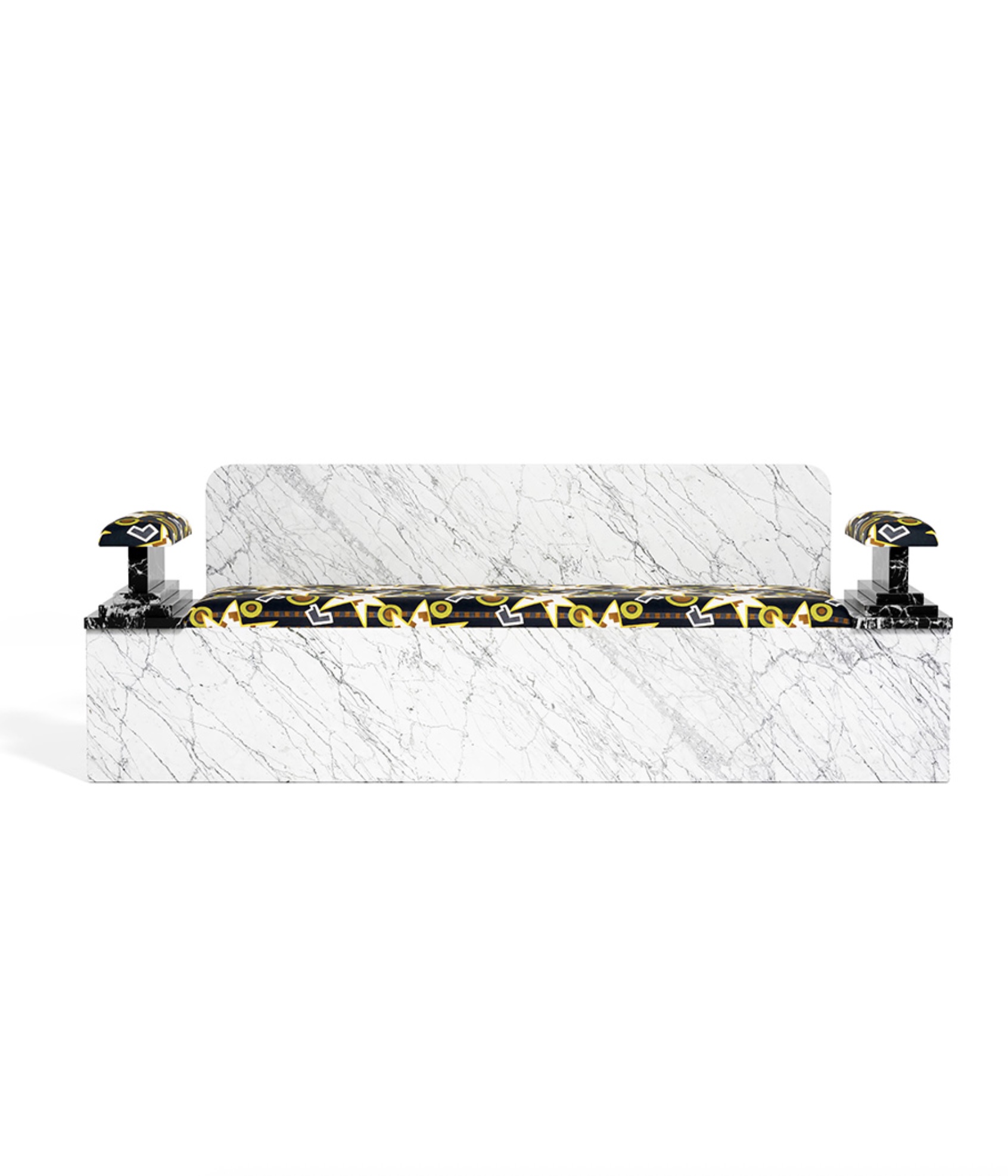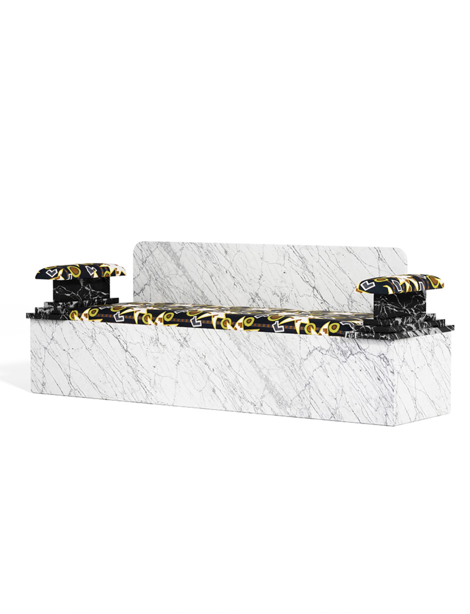 Sofa in white statuary marble and black marquina marble, upholstered in printed cotton. Fabric designed by Nathalie Du Pasquier.