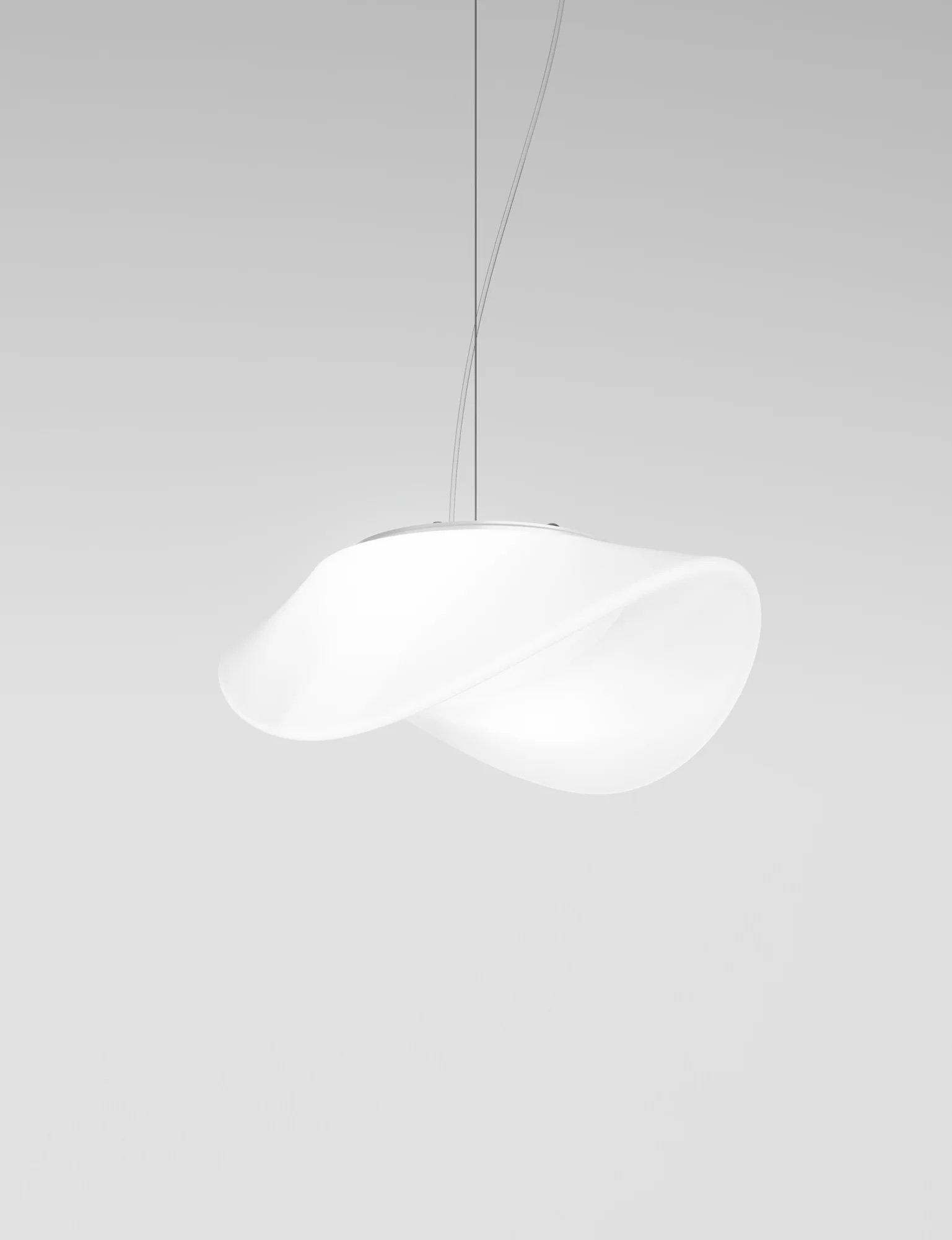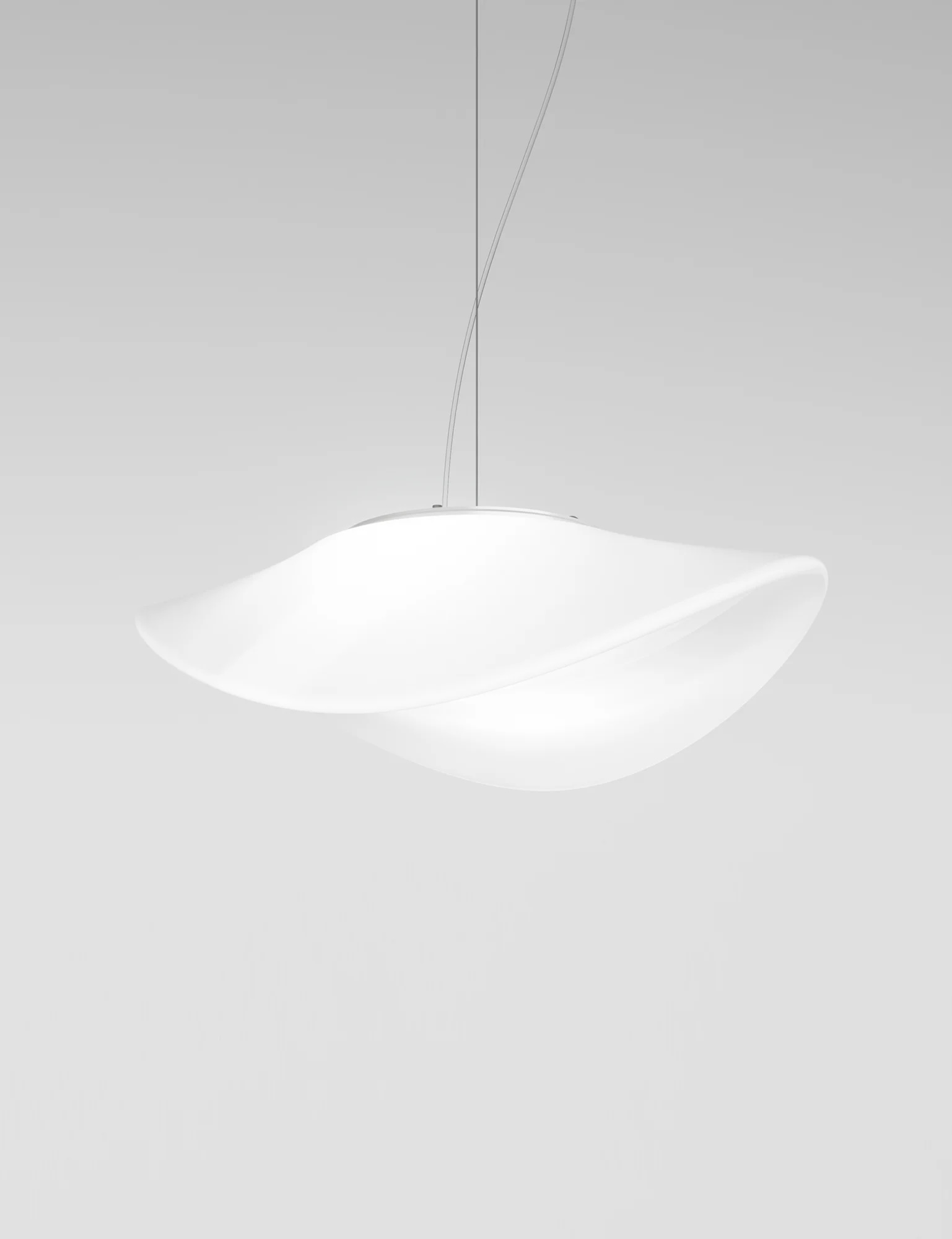 Inspired by the elliptic orbit of a planet around the sun, a motion that is created by the harmony and balance of unseen forces represented with the glass and the light. Available in three dimensions as suspension and ceiling.