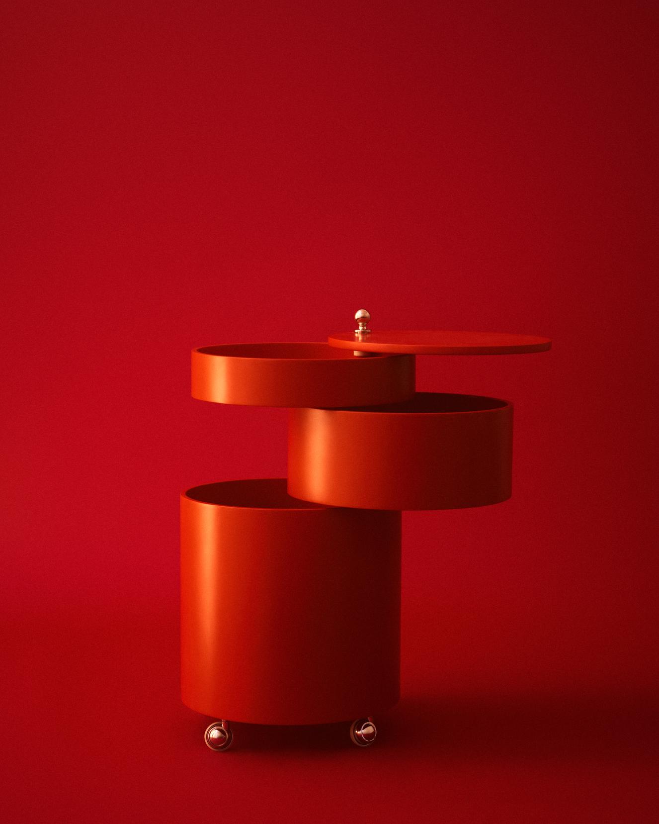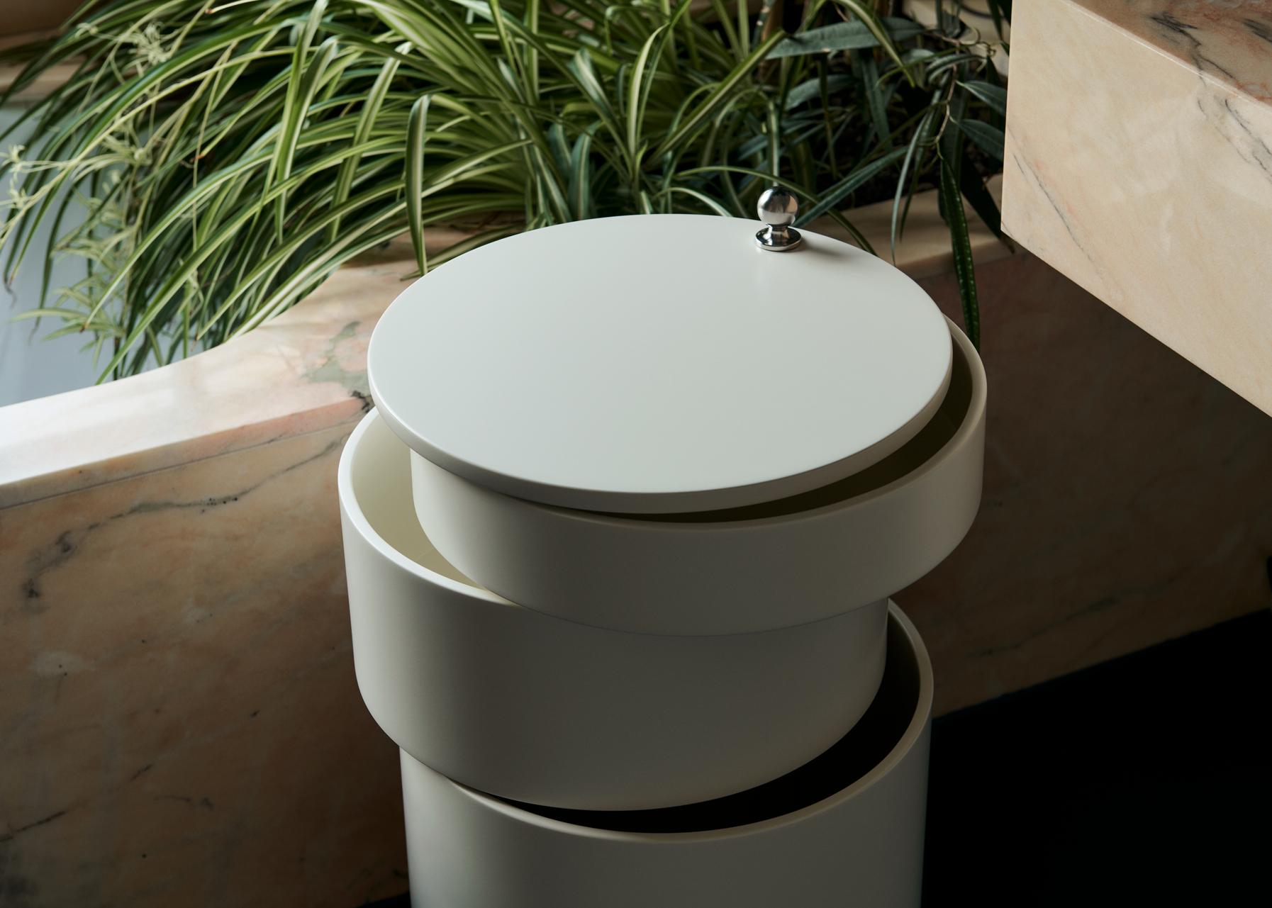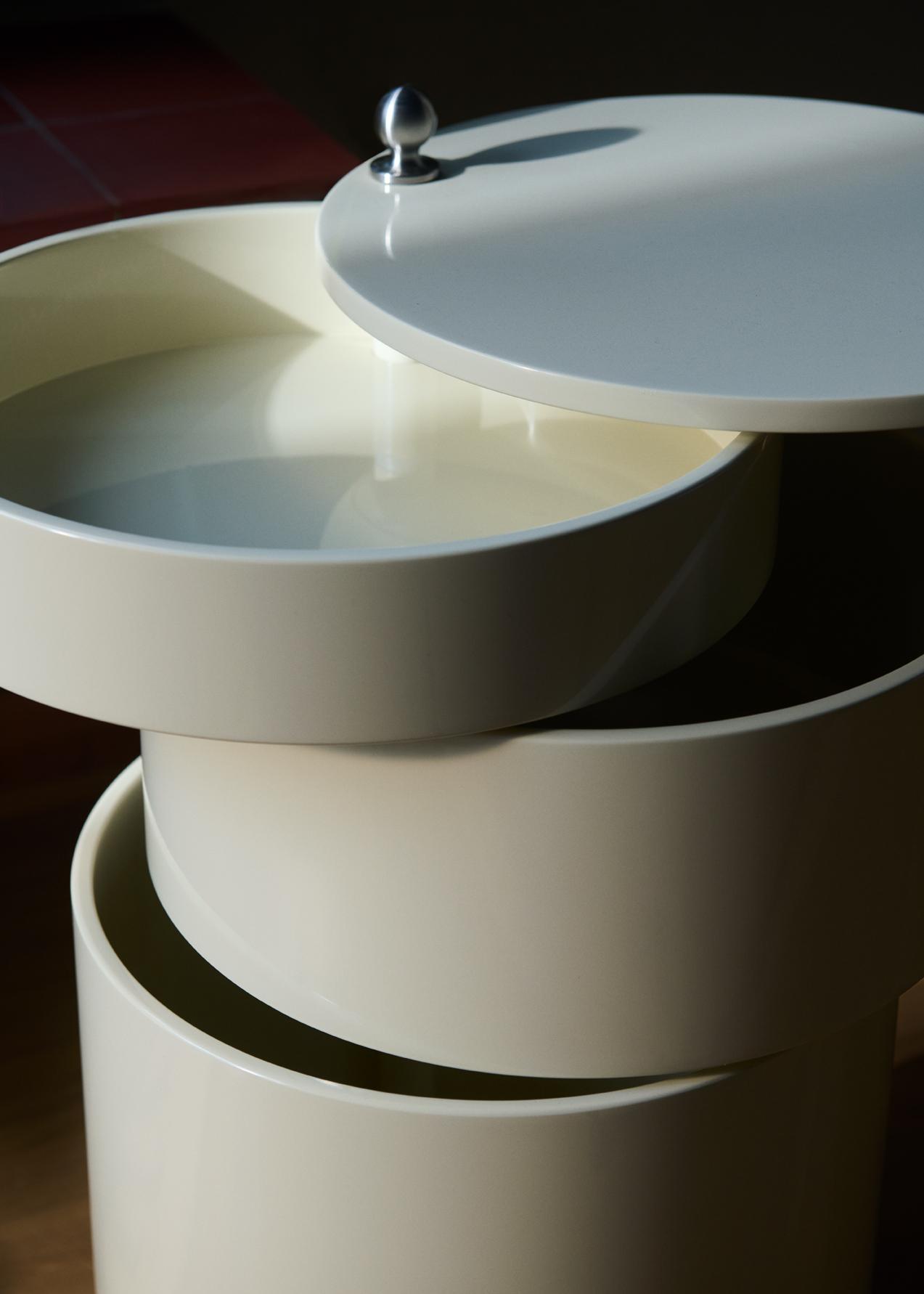 Adaptable side table and mobile storage unit in one. Barboy consists of three round-shaped drawers, which can be pulled out fully so the whole surface can be used. Barboy is a typical example of Panton’s furniture, in which he combines a matt surface with a shiny chrome handle and wheels, investing the piece with an elegant contrast.
