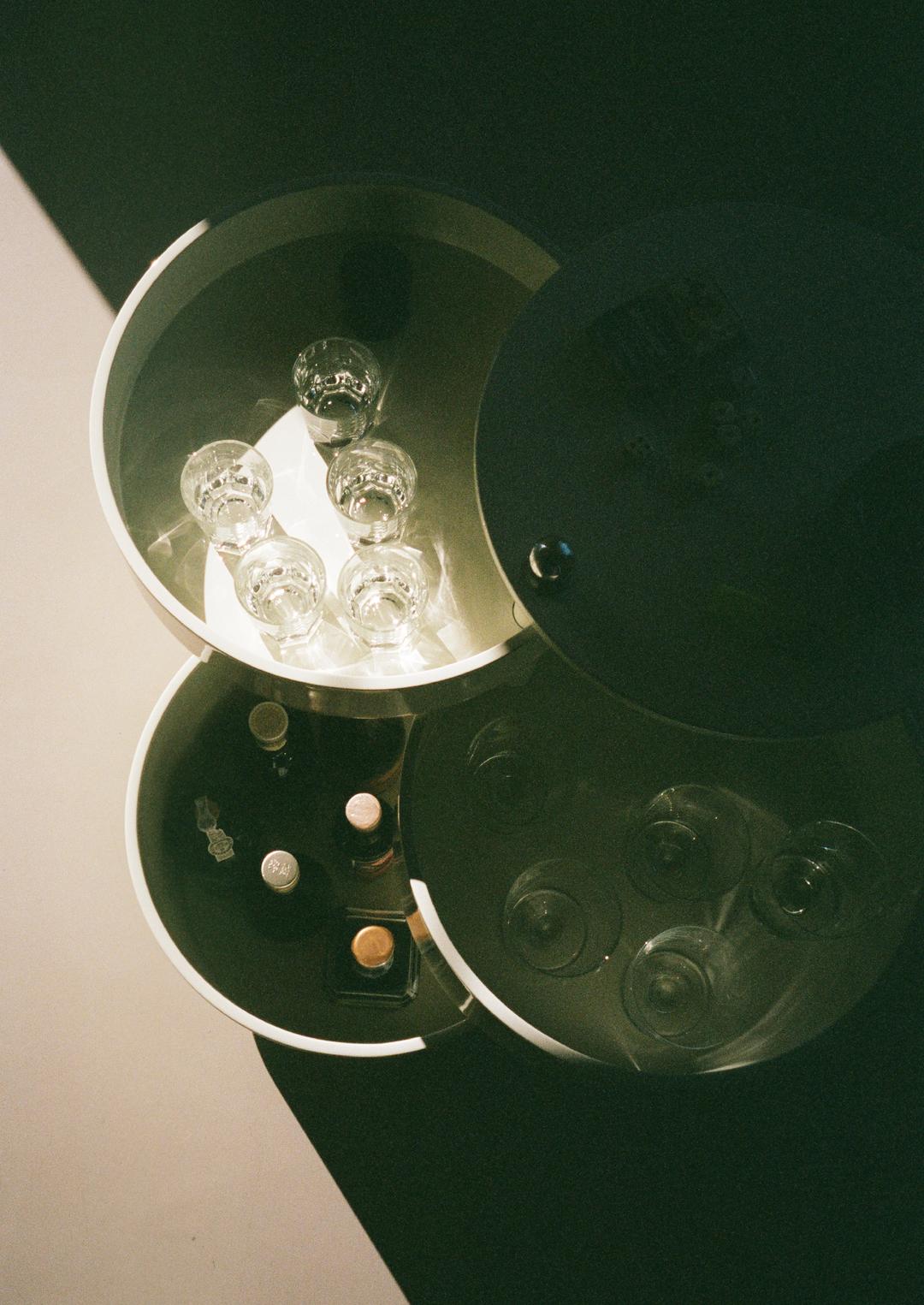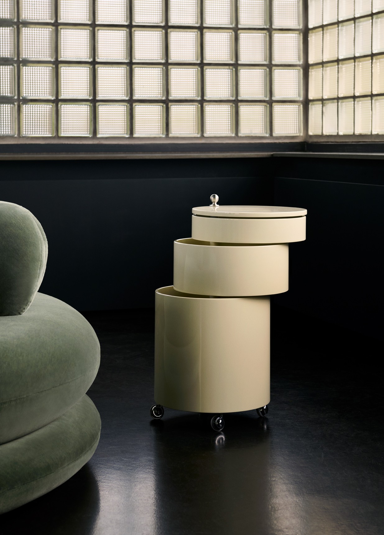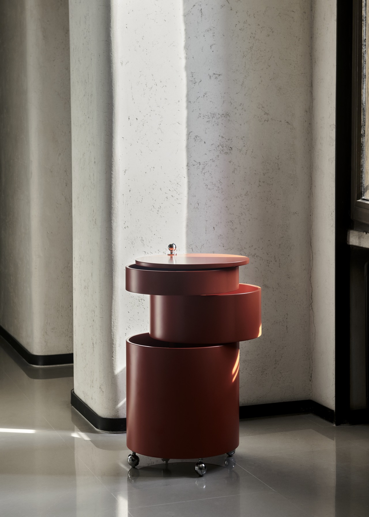 Adaptable side table and mobile storage unit in one. Barboy consists of three round-shaped drawers, which can be pulled out fully so the whole surface can be used. Barboy is a typical example of Panton’s furniture, in which he combines a matt surface with a shiny chrome handle and wheels, investing the piece with an elegant contrast.