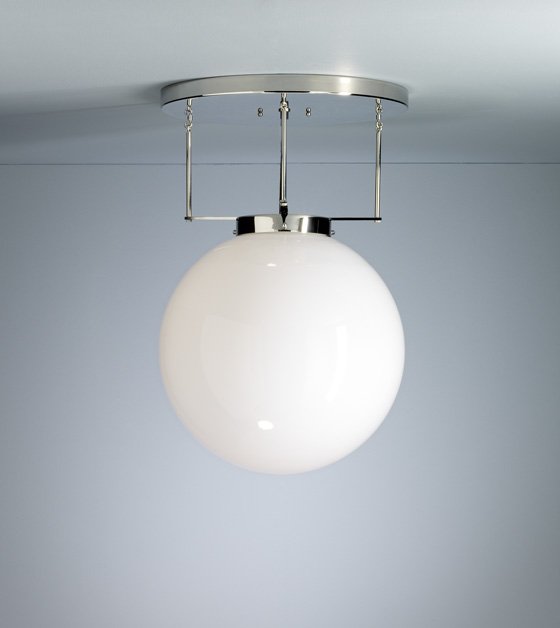 Marianne Brandt designed this ceiling lamp with an opal glass ball at her metal workshop in Dessau in 1926. The simple, unassuming and timelessly beautiful Bauhaus model became such an instant hit that it was produced in series. DMB 26 by TECNOLUMEN has an impressively timeless presence, which radiates beautifully in modern and classically furnished interiors. It was created in 1926 by the painter, sculptor, photographer and designer Marianne Brandt, one of the most prominent Bauhaus artists whose designs are now displayed at the Museum of Modern Art in New York and the British Museum in London. DMB 26 features an opal glass ball that appears to float through the room as it scatters its hazy light. The spherical lamp hangs from three 14-cm-short delicate rods attached to a circular baseplate. The glass ball comes in different sizes. While the glass is overlaid with opal, the metallic baseplate and rods have different finishes. The catalogue information seems to suggest the metal parts were all made of aluminium. As aluminium quickly oxidises and becomes unsightly, the lamp now features a nickel-plated or brass-plated surface. The optionally 250mm, 300mm, 350mmm or 400mm large opal ball is held by three rods and a ring as a holding device on the ceiling plate, which reflects the light of the ball. The ceiling lamp is available in nickel-plated metal or polished and zaponiert brass. Each lamp is numbered consecutively and bears the TECNOLUMEN / BAUHAUS logo.