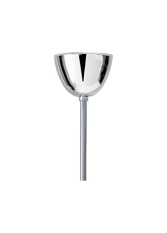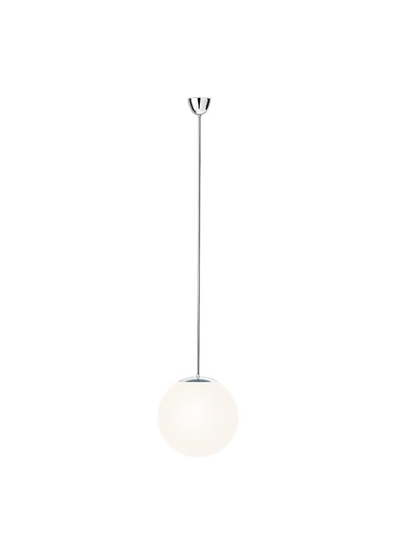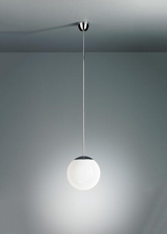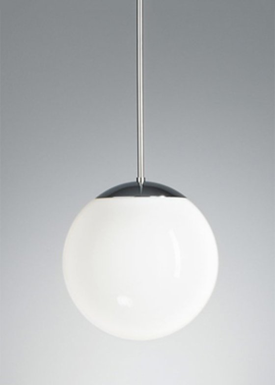 This hanging lamp, consisting of a chrome-plated or polished brass tube with an opal ball, was created by an unknown designer in 1900. It was one of the first lighting fixture designs developed for electric light bulbs. It has enriched the interior designs of many architects, such as Peter Behrens, Adolf Loos and Josef Hoffmann. The Bauhaus had similar designs by Marianne Brandt and Hans Przyrembel. This lamp was manufactured in large numbers in the 1920s and 30s, when it was mainly used in schools and offices. They are available in five sizes: with 200mm, 250mm, 300mm, 350mm and 400mm large opal balls. The chrome-plated or polished brass tube is 1m long, but can easily be shortened by sawing off, because the hanger holds the rod without thread. Each lamp is numbered consecutively and bears the TECNOLUMEN signet. Recommended illuminant: LED lamp 8W, matt.