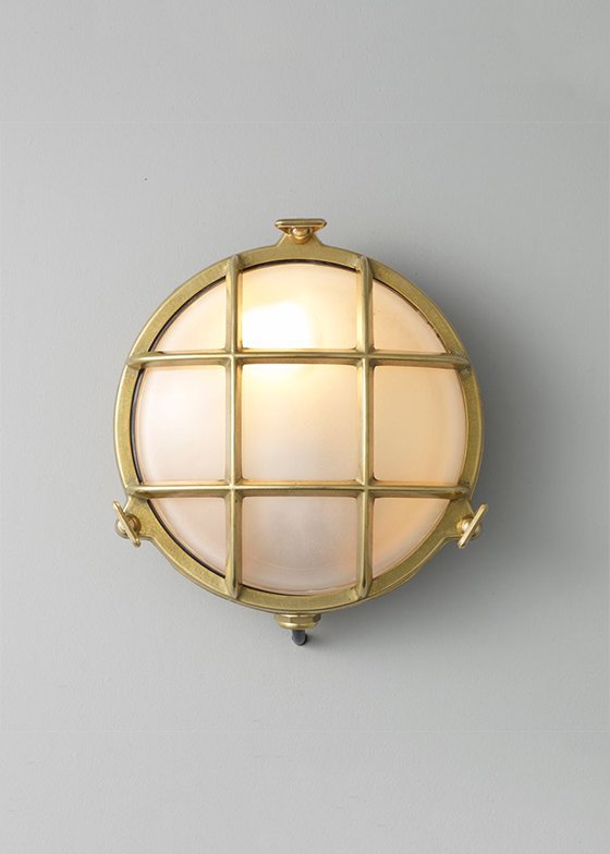 A die-cast bulkhead light in natural brass (unlacquered) with frosted glass diffusers. Also available in weathered brass and a chrome plated finish. Front guard secured by three wing nuts. Glanded surface cable entry.