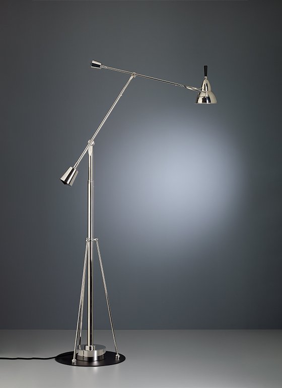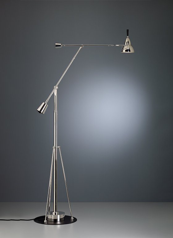 At 4.29 p.m. on 9th February, 1927 Eduard-Wilfrid Buquet feild his patent for parts of this table lamp, particularly the flexible joints, at the Ministère du Commerce et l'Industrie in Paris. Various versions were produced until the 1940's. Although little is known about Buquet we do know that he produced this lamp himself and probably designed it as well. In his lamp from 1927, Édouard-Wilfrid Buquet interprets the search for balance as a shift in weight. In fact, he describes this poetic shift of light in his patent as a “rotatable light fixture with articulated joints”. In practical terms, this construction allows the light head to be moved into almost any conceivable position by slightly shifting the weights. In addition to the table lamp, Buquet also developed wall and floor lamps according to the same principle. Although the French designer’s Bauhaus-style lamp became a global hit that was highly regarded and mentioned in several publications, little more is known about Buquet and his work. Tecnolumen had to modify certain details for technical reasons, namely the interior of the flexible joints and the stand, which used to be made of wood. Since the small reflector will only take a small holder, they have equipped the lamp with halogen 50 Watt. The transformer is housed in the stand, which is thus made of metal. Virtually all the parts have to be handmade. The brass, which is the metal used, has been finished with a 0.9000 silver coating, and finally brushed to provide a matt surface. The object rose to fame thanks to Lucien Rollin’s Desk of a Technician, made of oak and Swedish birch, which was exhibited alongside the lamp at the Salon of the Société des Artistes Décorateurs in 1929. Buquet’s design was presented to an even greater audience through publications in French magazines in the late 1930s. It became one of the most popular table lamp designs of the Art Deco period and the 1920s, and it was often integrated in the interior designs conceptualised by architects like Le Corbusier, Marcel Breuer, Joubert and Petit, Maurice Barret, Louis Sognot, and Marcel Coard. Buquet designed and produced several variations of the lamp until 1940, although the double-arm version proved to be the most popular due to its functionality. He even designed silver-plated versions. The price of an original lamp was set at $10,000 in 1997. Each lamp is numbered consecutively and bears the TECNOLUMEN signet.
