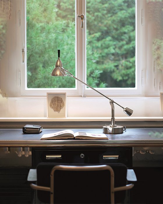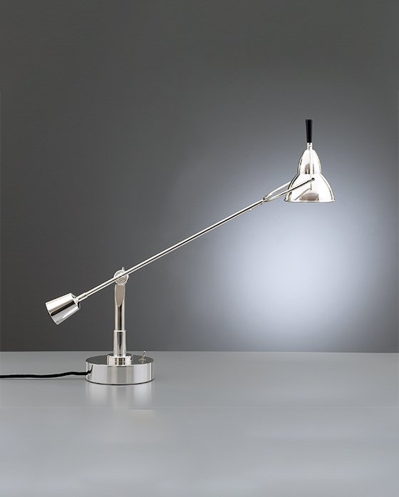 At 4.29 p.m. on 9th February, 1927 Eduard-Wilfrid Buquet feild his patent for parts of this table lamp, particularly the flexible joints, at the Ministère du Commerce et l'Industrie in Paris. Various versions were produced until the 1940's. Although little is known about Buquet we do know that he produced this lamp himself and probably designed it as well. The “Buquet” table lamp is impressively functional, stunningly elegant and mysteriously fragile. It was developed in 1925 by a French engineer and designer by the name of Édouard-Wilfrid Buquet. He must have suspected that he’d created something special, as he patented parts of the lamp, especially the joints, at the Ministry of Industry and Commerce in Paris just two years later on 9 February 1927 – at 16:29, to be precise! While we know that Édouard-Wilfrid Buquet developed many fine lamps, that’s sadly where our knowledge about him comes to an end. However, the shape of the EB 27 table lamp perfectly reflects his feel for aesthetics and functionality, which was closely related to the esprit of the Bauhaus movement. In his lamp from 1927, Édouard-Wilfrid Buquet interprets the search for balance as a shift in weight. In fact, he describes this poetic shift of light in his patent as a “rotatable light fixture with articulated joints”. In practical terms, this construction allows the light head to be moved into almost any conceivable position by slightly shifting the weights. In addition to the table lamp, Buquet also developed wall and floor lamps according to the same principle. Although the French designer’s Bauhaus-style lamp became a global hit that was highly regarded and mentioned in several publications, little more is known about Buquet and his work. The object rose to fame thanks to Lucien Rollin’s Desk of a Technician, made of oak and Swedish birch, which was exhibited alongside the lamp at the Salon of the Société des Artistes Décorateurs in 1929. Buquet’s design was presented to an even greater audience through publications in French magazines in the late 1930s. It became one of the most popular table lamp designs of the Art Deco period and the 1920s, and it was often integrated in the interior designs conceptualised by architects like Le Corbusier, Marcel Breuer, Joubert and Petit, Maurice Barret, Louis Sognot, and Marcel Coard. Buquet designed and produced several variations of the lamp until 1940, although the double-arm version proved to be the most popular due to its functionality. He even designed silver-plated versions. The price of an original lamp was set at $10,000 in 1997. Tecnolumen had to modify certain details for technical reasons, namely the interior of the flexible joints and the stand, which used to be made of wood. Since the small reflector will only take a small holder, they have equipped the lamp with halogen 50 Watt. The transformer is housed in the stand, which is thus made of metal. Virtually all the parts have to be handmade. The brass, which is the metal used, has been finished with a 0.9000 silver coating, and finally brushed to provide a matt surface. Silver-plated metal with 90s edition. Alternatively available: nickel-plated metal. Each lamp is numbered consecutively and bears the TECNOLUMEN signet.