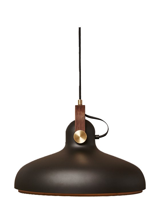 A large modern pendant with a wide opening that directs perfect diffused light for everyday use. Ideal for that perfect dining experience, family gatherings or any desktop activity. Fashioned in the familiar sleek stylings of earlier models, the exact materials has been manipulated to create yet another masterpiece in modern lighting design. CARRONADE Large comes in a black painted finish with brass discs and American walnut details. The exact manufacturing principles for this beautiful series with attention to detail, were used to create this stunning pendant that nestles comfortably among its counterparts.