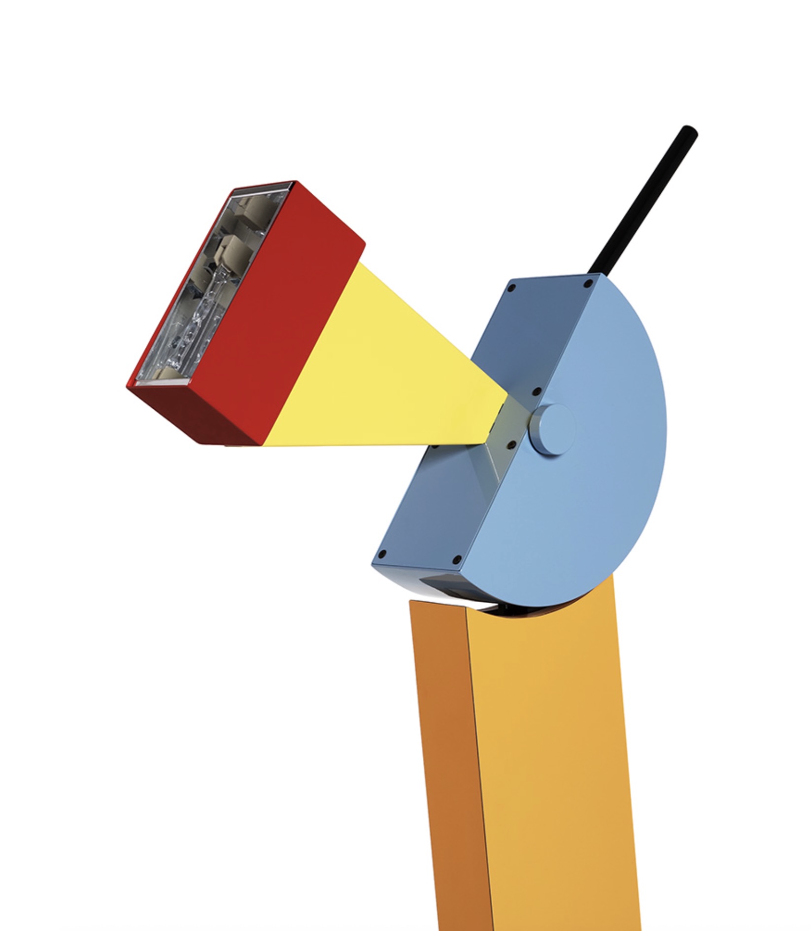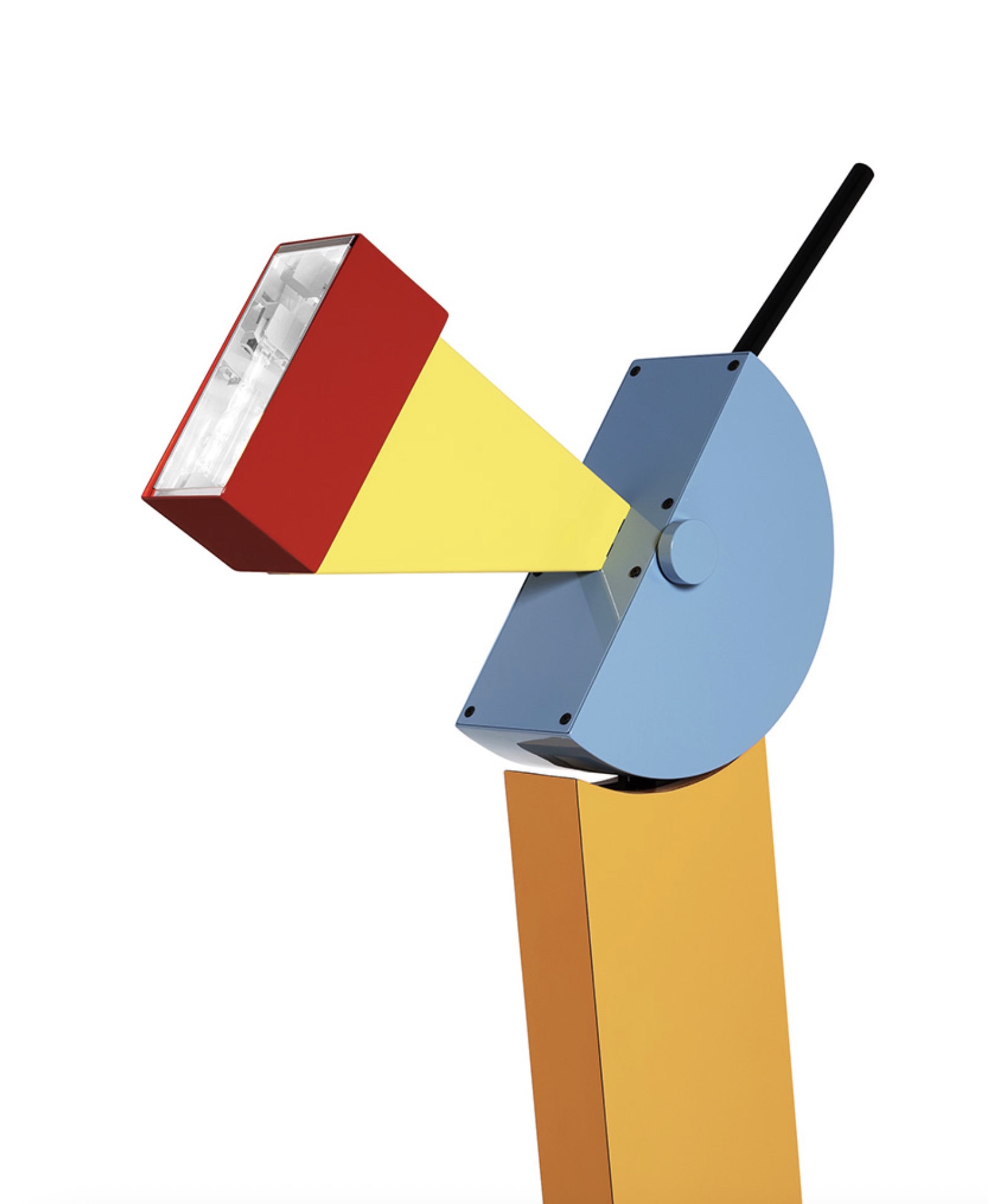 With a predominance of yellow and contrasting colors, the Cavalieri lamp designed by Ettore Sottsass makes an emphatic statement with simple stacked geometric shapes. The playful assembly, completely detached from any sense of "seriousness," recalls the Tahiti table lamp, yet features a more linear design, devoid of any zoomorphic reference.