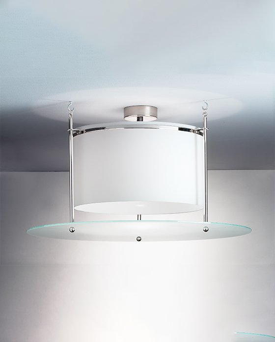 Various lamps designed by Marianne Brandt are described, dimensioned and illustrated in detail in the 1928/29 catalogue published by Schwintzer&Gräff. These lighting fixtures were already being mass-produced back then. The precise catalogue details have allowed us to faithfully restore some of the lamps. Ceiling lamp made of nickel-plated metal, opal and etched matt glass. Each lamp is numbered consecutively and bears this symbol: TECNOLUMEN / BAUHAUS.