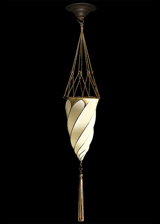 A cesendello, or sanctuary lamp, has its roots in Rome and Byzantium, and later became popular in Venice and the Muslim world. The profile of this elegant spiral structure recalls the twist of a turban. The refined silhouette represents the synthesis of the Oriental and Renaissance themes present in Venice as early as the 15th century. This Fortuny Cesendello silk ivory lamp can be ceiling mounted.