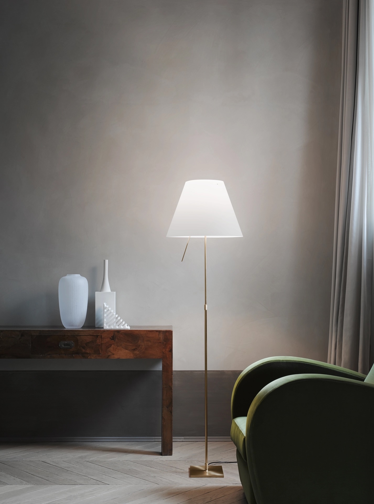 The charming, inimitable and modern reinterpretation of the traditional abat-jour. The central focus of the design is the essence of light, thanks to the poised, simple but at the same time rigorous image. The large Costanza family, with its forthright presence, manages to be simultaneously new and classical, combining advanced light sources with forms from the past. A lamp that adapts to all kinds of uses thanks to its many models, with different sizes and functions.