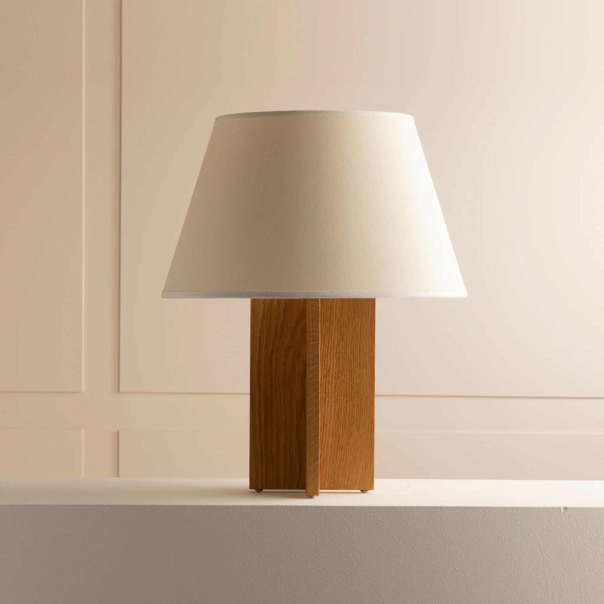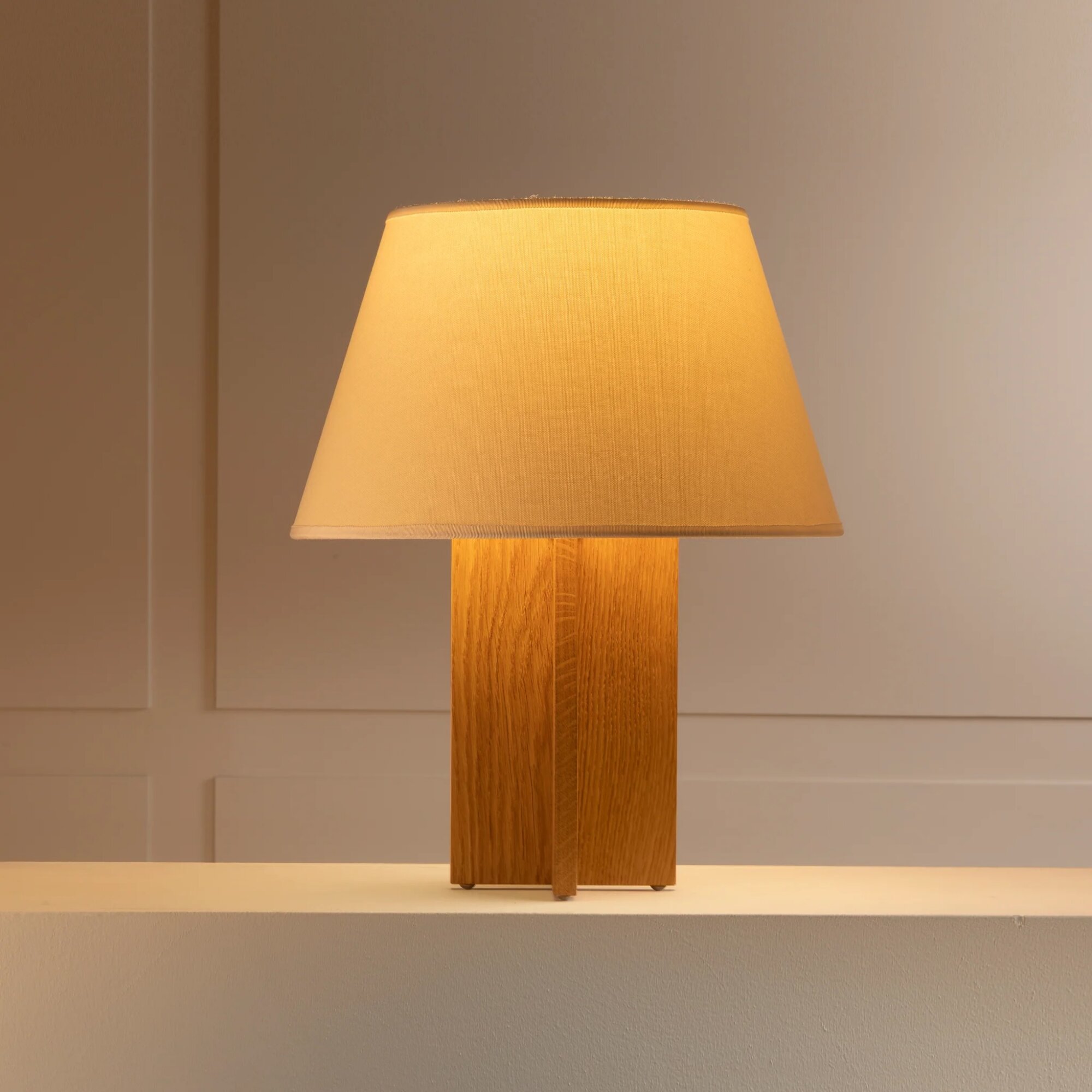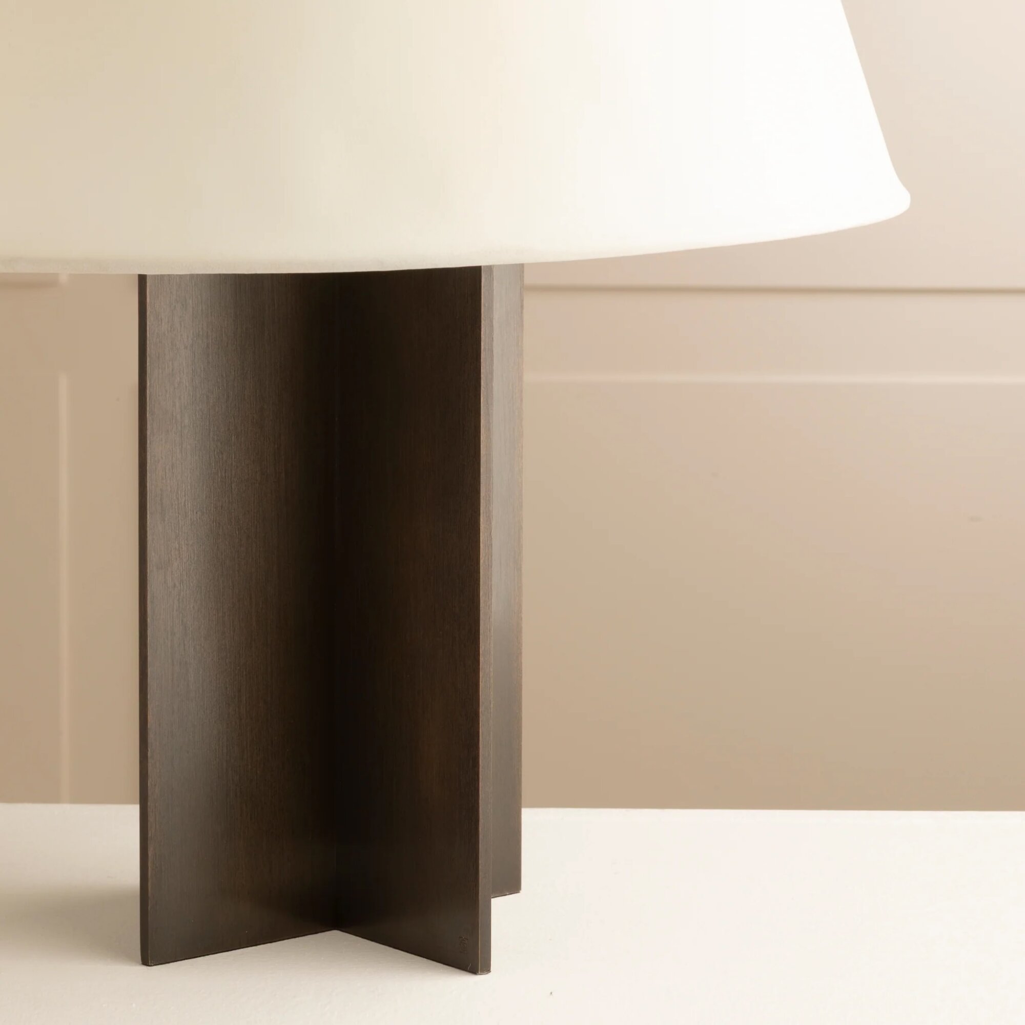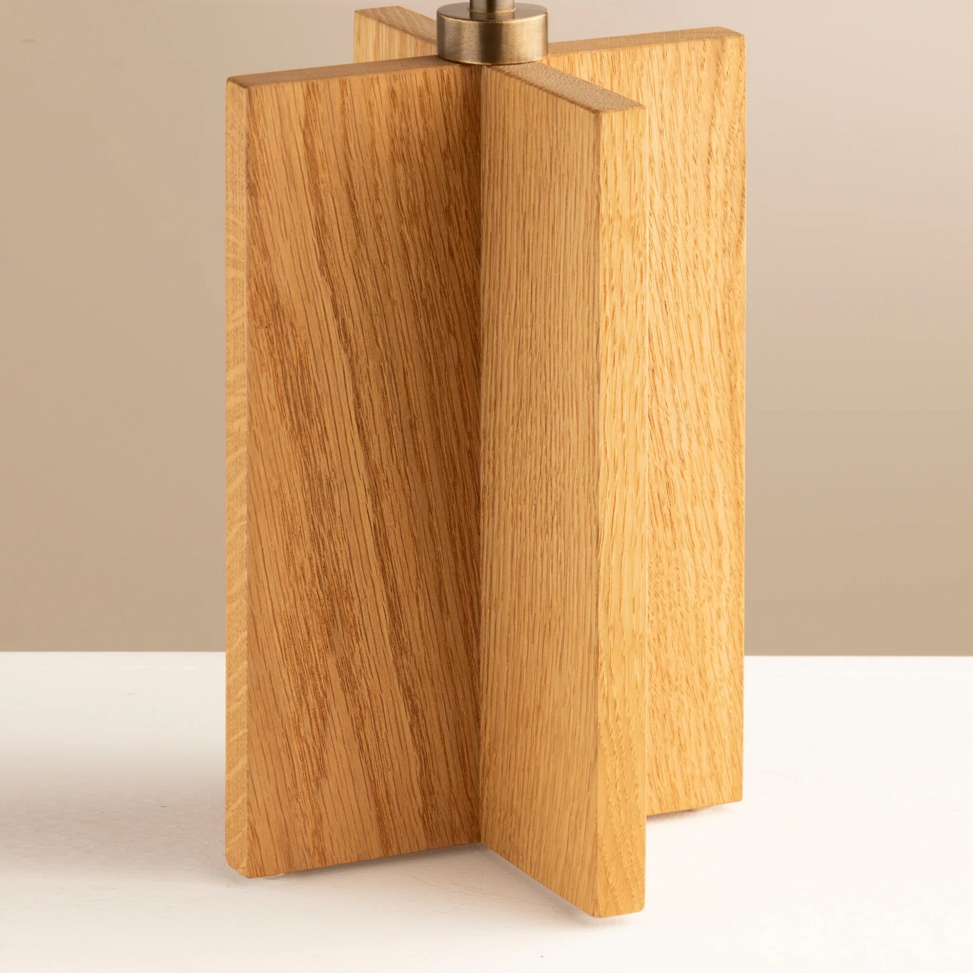 Varnished solid oak, patinated brass & cotton, silk or parchment. Available in different wood species & finishes.
