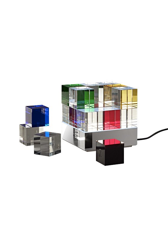 With the addition of an innovative radio control to the established CUBELIGHT, it is possible to control the luminous object via a radio control cube from a distance of up to 12 meters. In addition to switching it on and off, the light color temperature can be set continuously between 2700K and 6500K and the light intensity can be dimmed. To do this, the radio control cube is simply tilted and rotated in different directions. Acceleration sensors from aircraft construction make these functions possible. All components and parts of the CUBELIGHTmove are "Made in Germany". This design classic is based on Bauhaus architecture and allows an infinite number of geometric design options and color combinations. The clear and reduced design creates a timeless appearance, which is underlined by the classic materials used, glass and stainless steel. The handcrafted edges of the glass cubes and the new indirect LED lighting create a variety of light reflections and plays of light, even when switched off, which stimulate the imagination and fascination with this innovative design lamp. MSCL3 Comes with 18 glass cubes. 14 clear white cubes and one each in blue, red, yellow and green. MSCL 4 Comes with 18 glass cubes. 10 clear white dice and four each in pink and black. Each lamp is numbered consecutively and bears the TECNOLUMEN logo.