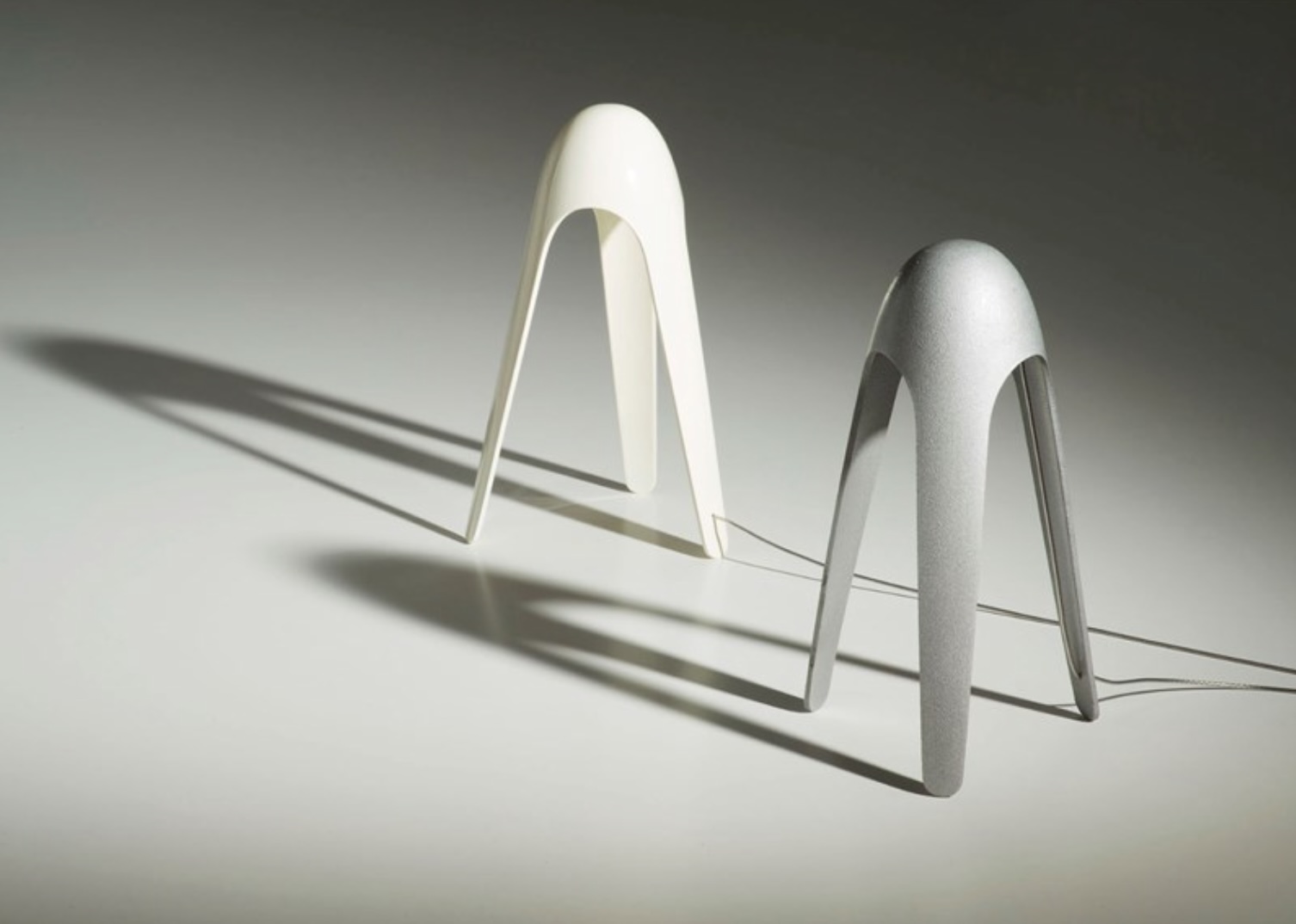 The futurist design of the tripod table lamp by Martinelli Luce is reminiscent of a stylized octopus. It is an organic shape that is unmistakably signed by Karim Rashid.