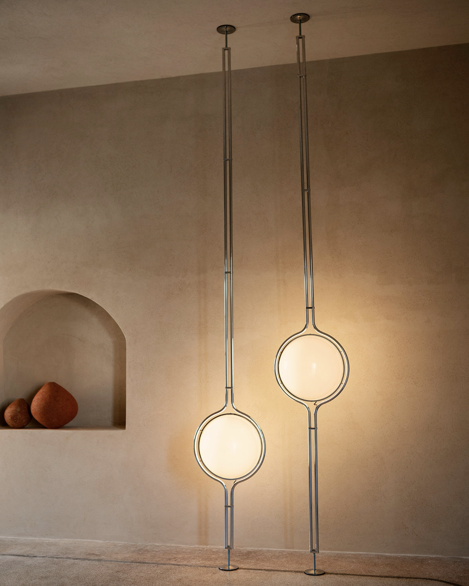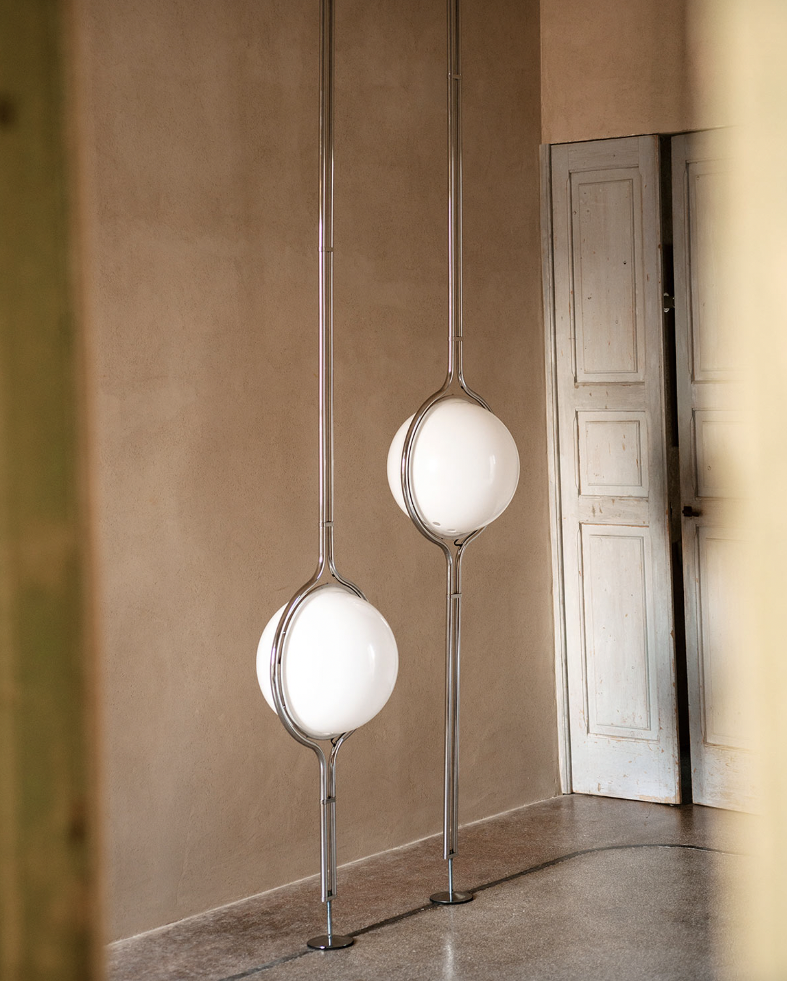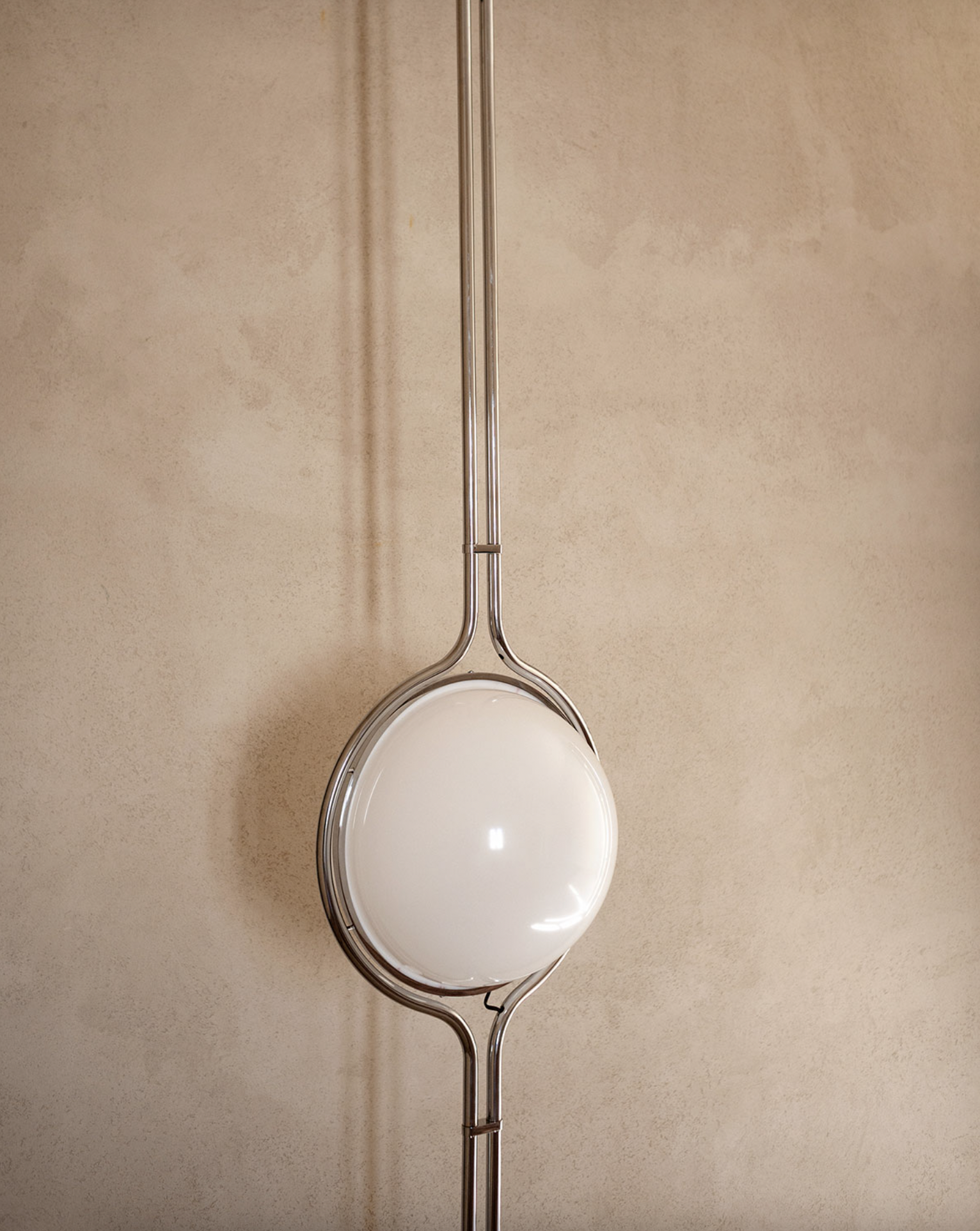Dana by Jean-Pierre Garrault and Henri Delord for Tacchini. A luminous sphere seems almost suspended in time and space. A metal structure seduces the gaze with its striking simplicity and the boldness of its construction. The extroverted Dana by Jean-Pierre Garrault and Henri Delord fits perfectly into the constant search for timeless pieces carried out by Tacchini: a lamp with a strong personality. Born from free creative thought and full of the artistry of the 70s, rediscovered by Tacchini to leave an unmistakable mark in any room. Dana’s idea was born in 1970 during a trip to Japan, when the designers decided to climb Mount Fujiyama and one evening, during a stop in a traditional Japanese inn, they were lucky enough to see the full moon rise and pass over the top of the mountain: hence the intuition to create a lamp with large luminous spheres that seem to rise towards the sky. The project then comes to life following a working method inspired by the “Meccano” which decrees its originality, a systematic search to reduce technical solutions to a few elements that allow multiple solutions. Today, re-edited in agreement with the two designers, Dana is presented in a floor-to-ceiling version with a tubular structure in chromed metal and a sphere of light in composite material.
