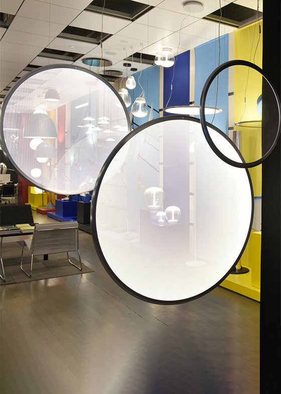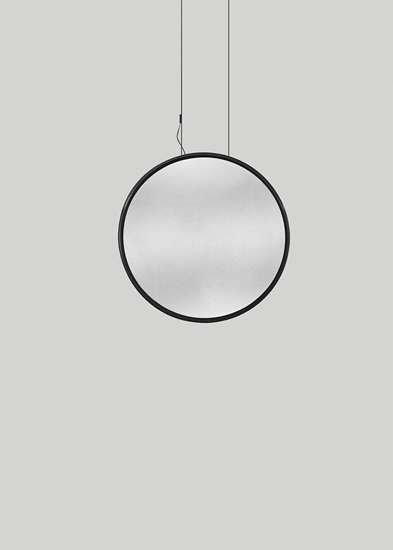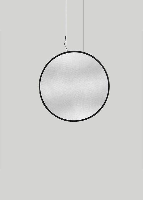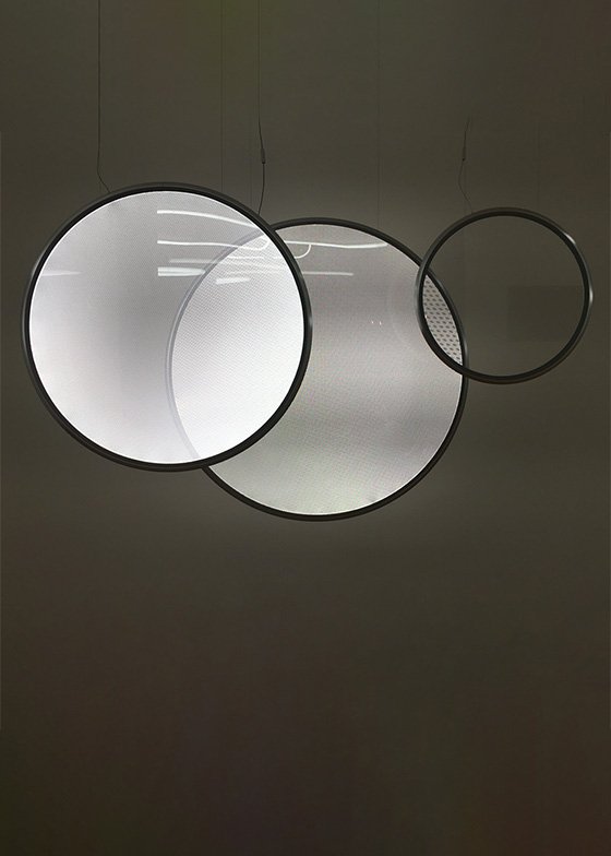 Discovery Vertical Suspension by Artemide. Available in horizontal suspension and wall versions. Discovery Vertical Suspension has a lightweight aluminum ring housing an LED strip that injects light into a specially worked surface with micro particles so small that the surface is hardly perceptible when the appliance is turned off. When the appliance is turned on, the transparent interior appears to fill with light as if by magic, as absence is turned into a perfectly diffusing emitting surface.