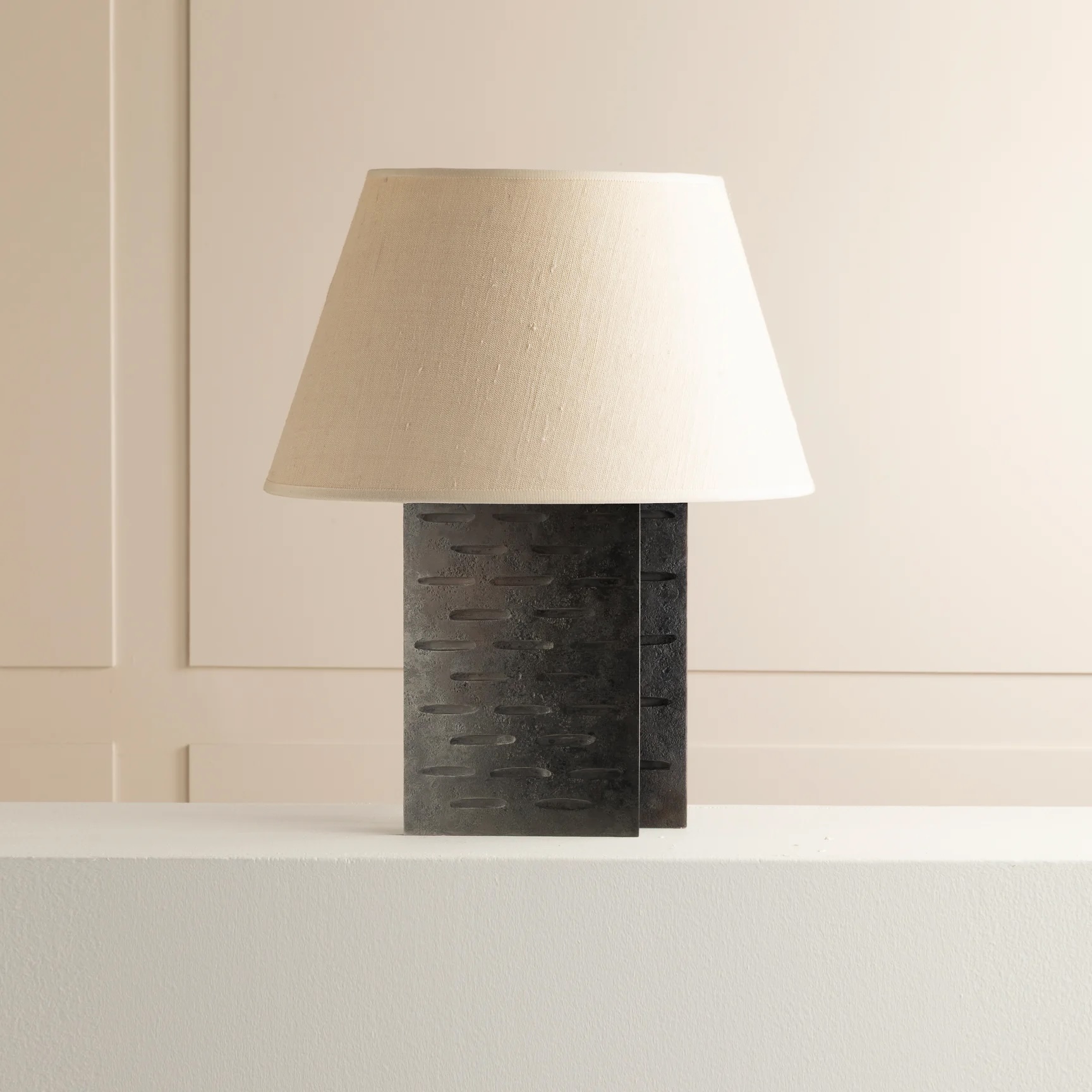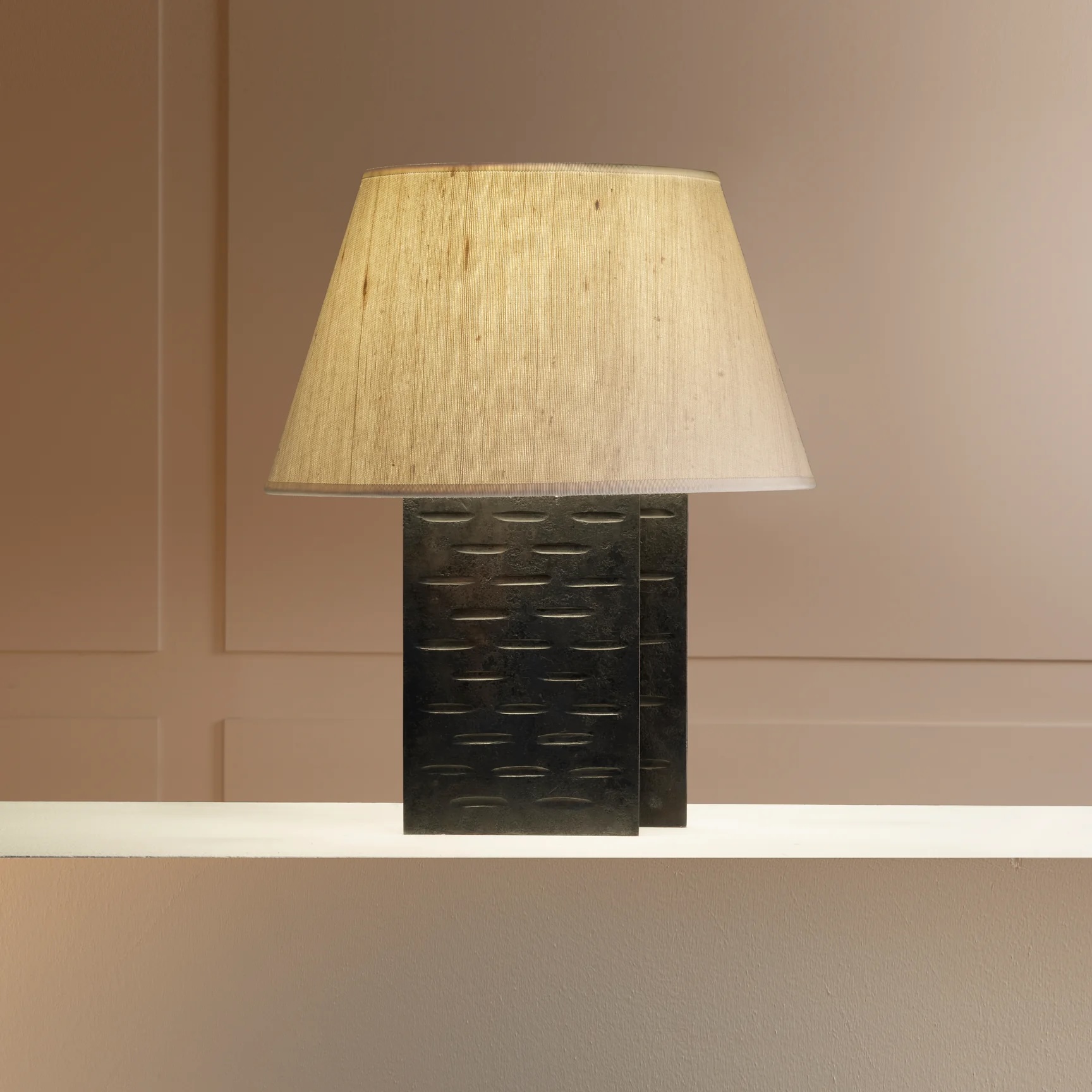 Waxed wrought iron, patinated brass and cotton, silk or parchment.