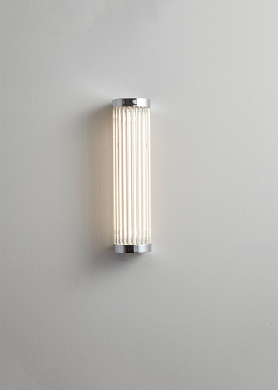 The 7212 LED Pillar Wall Light has the narrowest profile out of the Pillar collection. A welcome addition to any bathroom, its Art Deco-inspired curved profile is made of 8mm diameter solid glass rods. Available in weathered brass, polished brass or chrome plated finishes, and in two different sizes (H: 27cm x W: 7cm or H: 40cm x W: 7cm). The light has a 12V LED light source, which requires a remote transformer.
