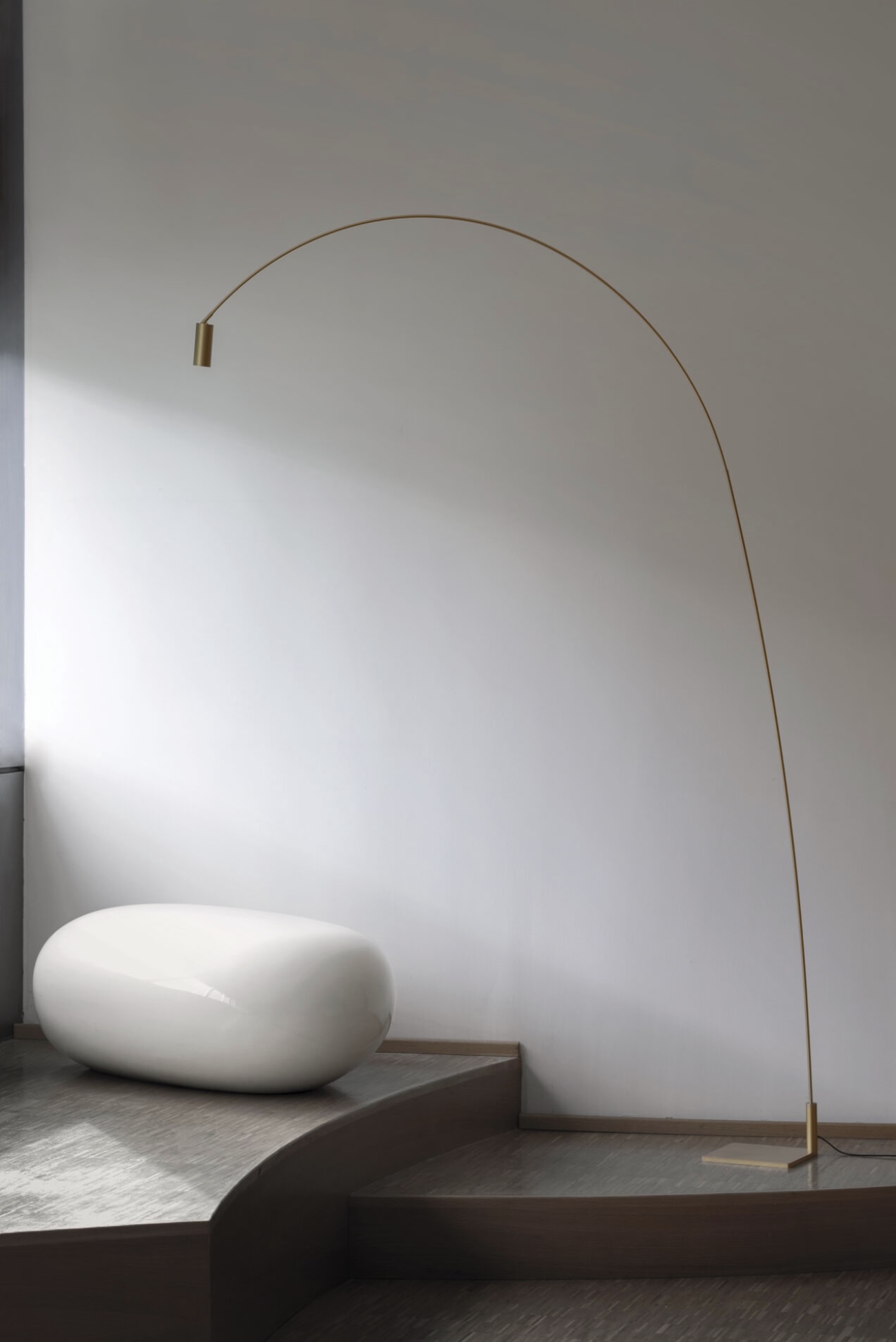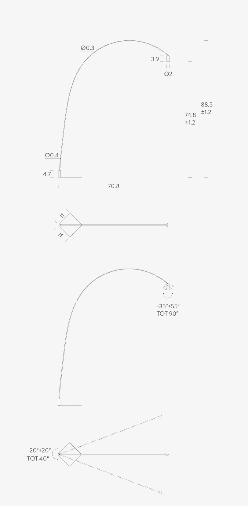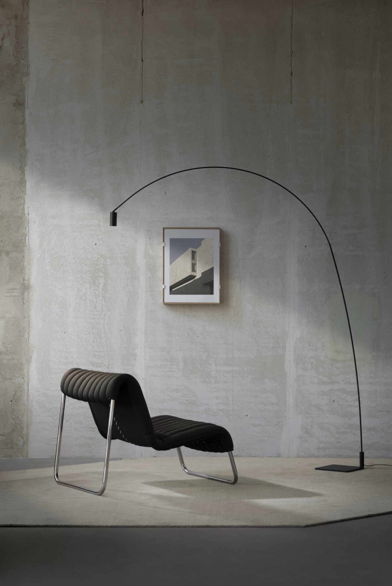 Essential aesthetics and pure functionality. The swivelling arc in matte black painted steel allows wide movement, and gives the opportunity to both interact and decorate the space. The cylindrical spot, with optional anti-glare filter, allows the light to be directed as required. The light beam is warm and diffuse.