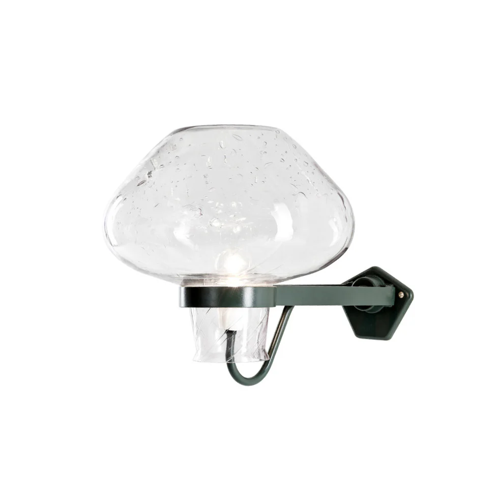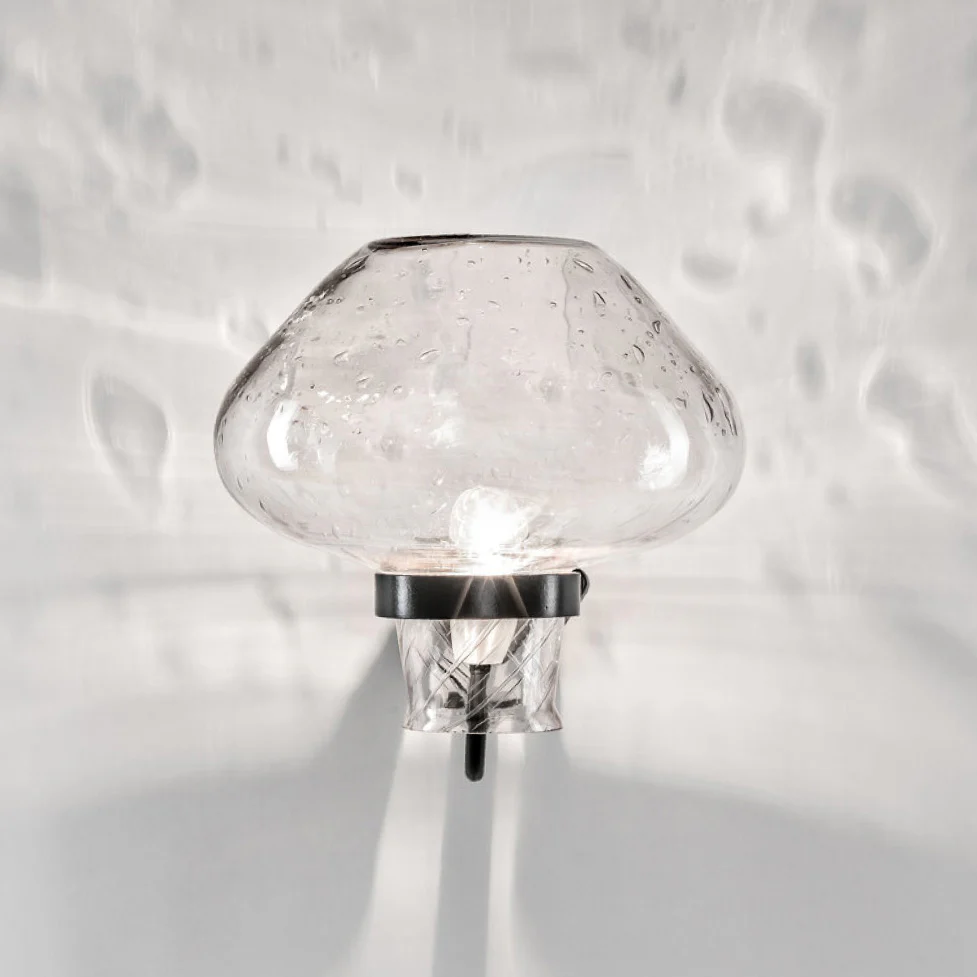 GA9 is a wall fixture that evokes the fluid grace of a rising drop of water, appearing to float gently along the wall. Its mouth-blown, handmade glass, filled with natural bubbles, captures and scatters light, creating a delicate interplay of shadow and illumination that evokes the rippling movement of water.