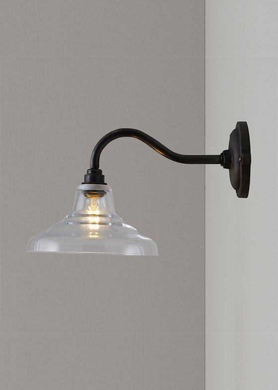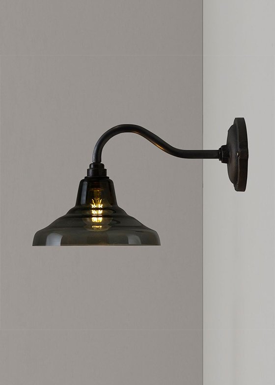 A smaller version of Davey Lighting's classic School Light, produced in hand blown glass, and designed as a compact wall light fitting. The glass shades come in either opal, anthracite and clear glass, with a weathered brass arm and back plate. The anthracite and clear glass shades show off the filament exposed light bulb, a nod to this continuing lighting trend.