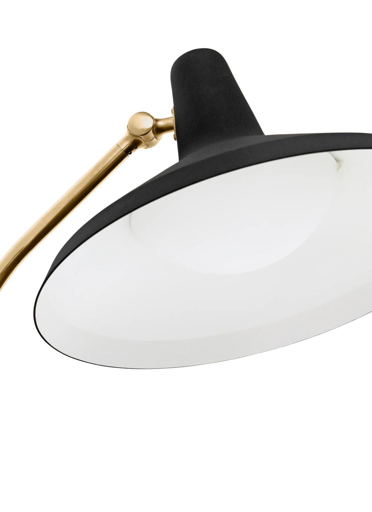 The lamp tilts to direct its pleasant, warm light downward. A sleek, angled stem supported by a rounded base anchors its silhouette, making it ideal for reading corners or ambient layering in modern interiors. Finishes include matte black with brass elements and an opal glass diffuser that softens glare.