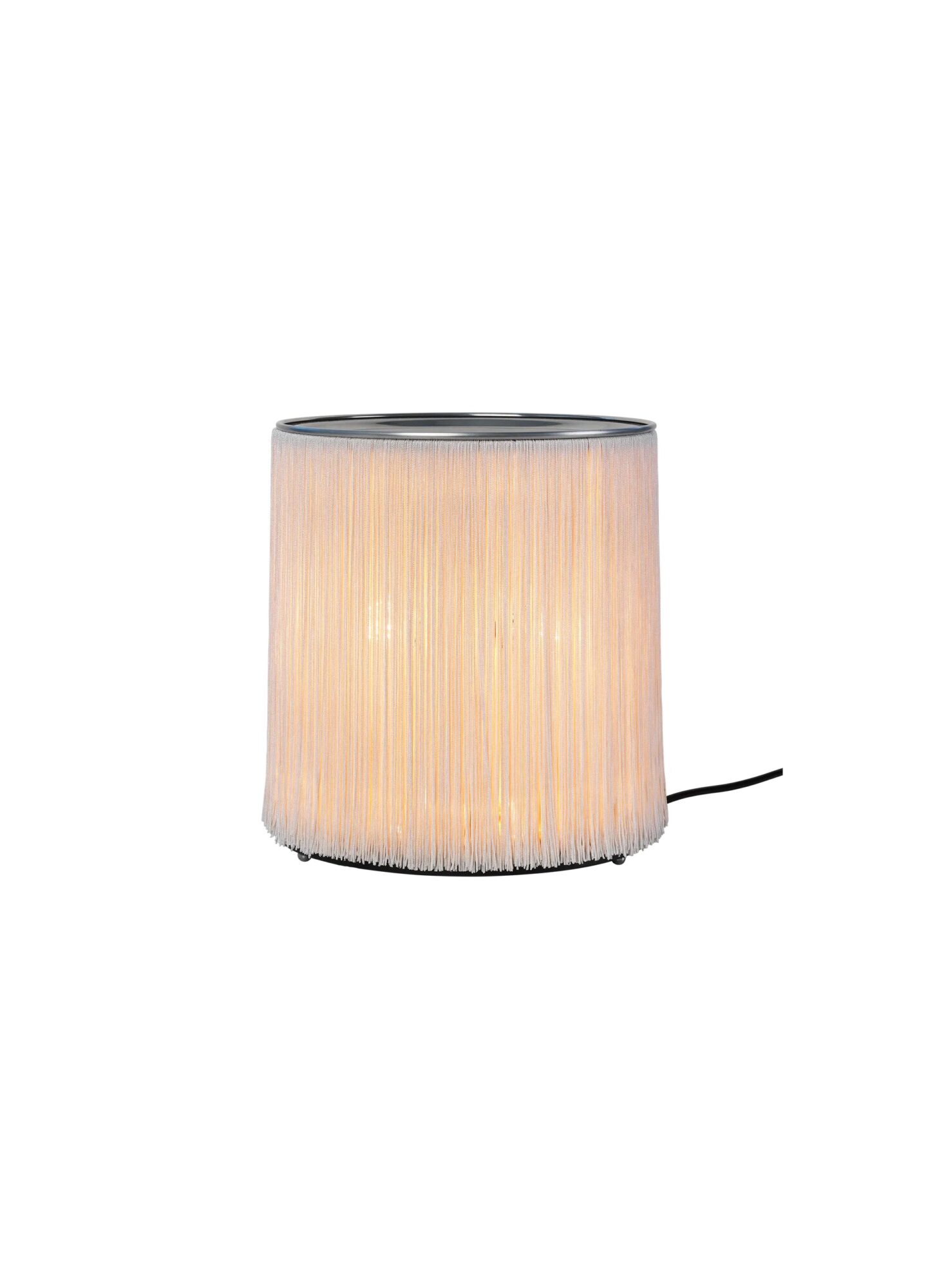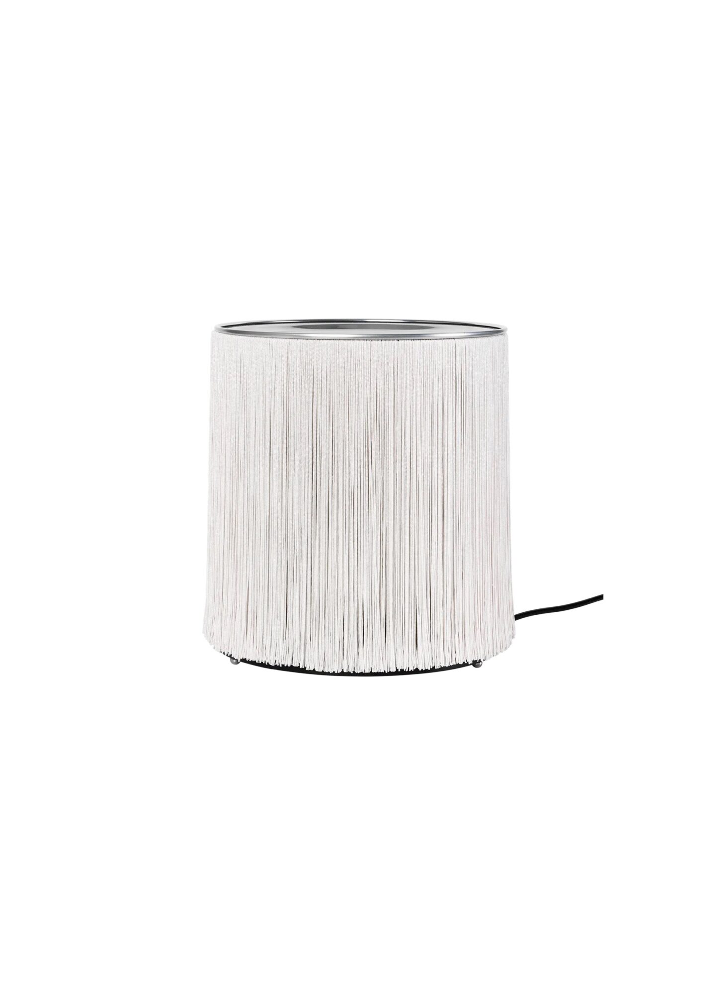 The lamp features a diabolo-shaped aluminum base trimmed with nylon fringes. It emits soft, ambient light through multiple lateral bulbs and produces an uplight from a central bulb above. A dual-button switch gives you precise control over the glow, and the reflection off the polished aluminum enriches its luminosity.
