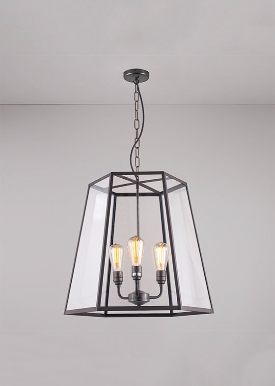 A new, broader based Hex Pendant. This larger sized light has 3 lamps, creating a strikingly architectural silhouette for internal settings. Elegant and robust, the Hex is available in a weathered brass finish, with clear glass panels.