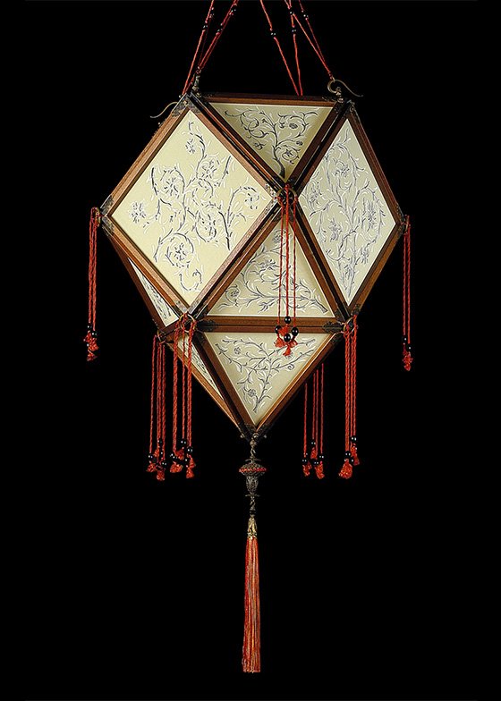 The Fortuny® Concubine Imperiale silk lamp, or imperial concubine, evokes the allure of Oriental culture, which enthralled Mariano Fortuny. The lamp features a triangle-square pattern, binding it with fiery red threads. The result is original and enigmatic, with a wood structure that protects the silk and enhances its silvery patterns.