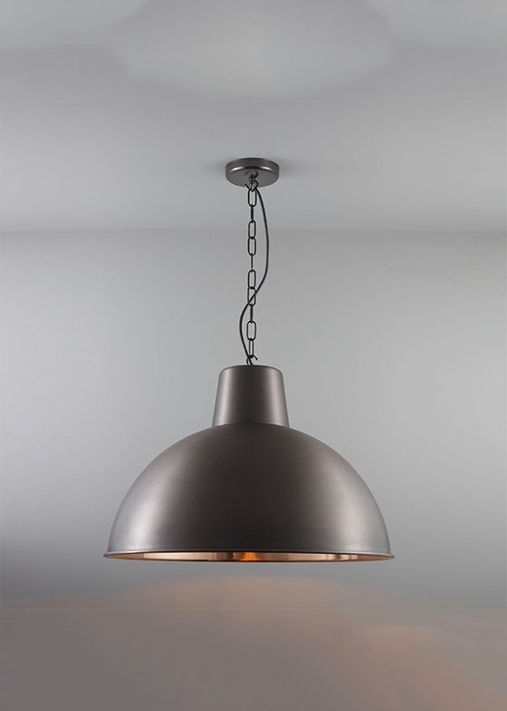 Davey's Large Spun Reflector is a beautifully simplistic, factory-inspired hanging light. A regular feature in kitchens and restaurants around the world, this industrial pendant is available in two finishes - polished ALUMINUM or weathered copper with a polished copper interior. The production technique leaves a distinctive imprint in the metal, giving each light a delightfully individual, unprocessed look.