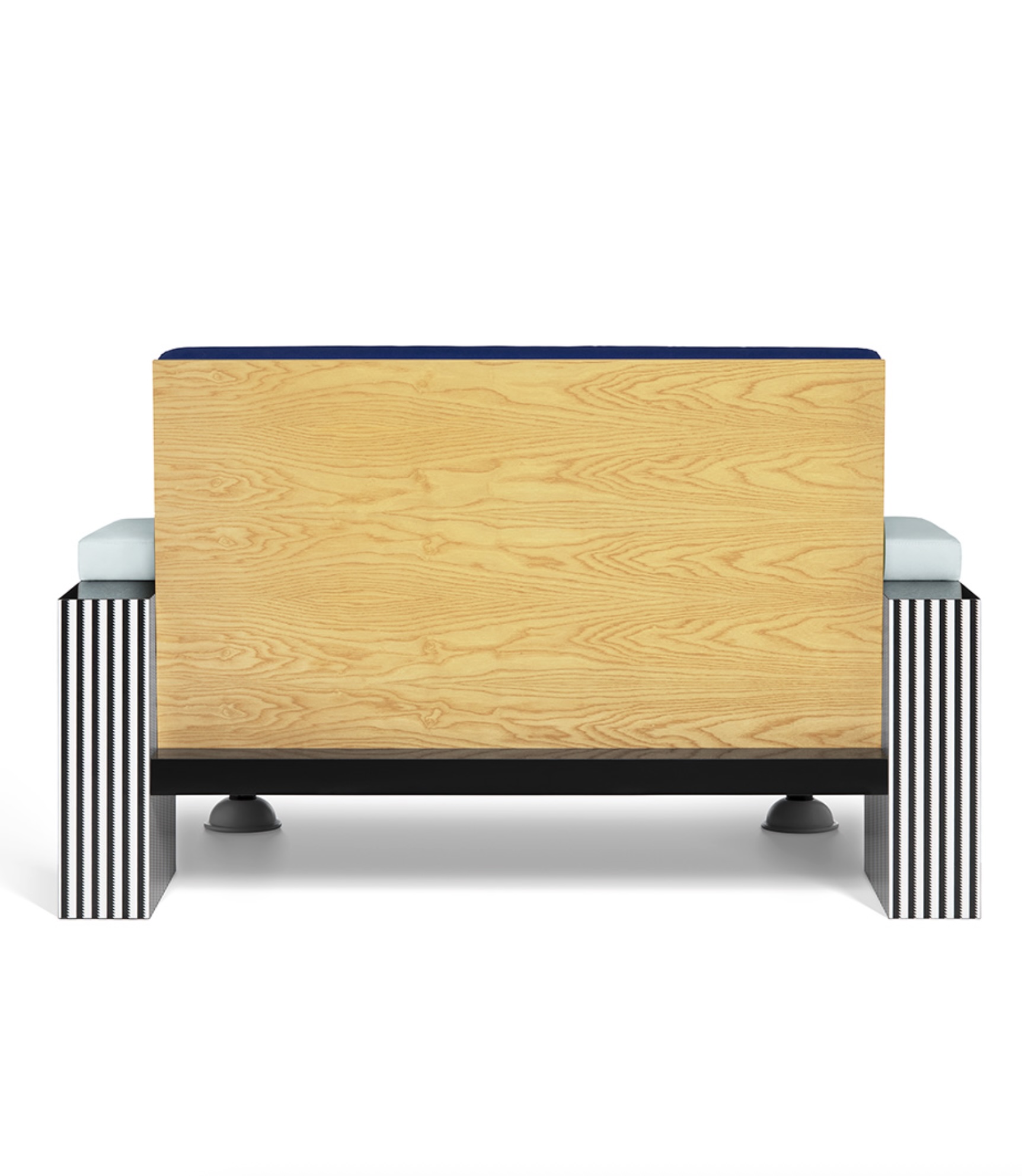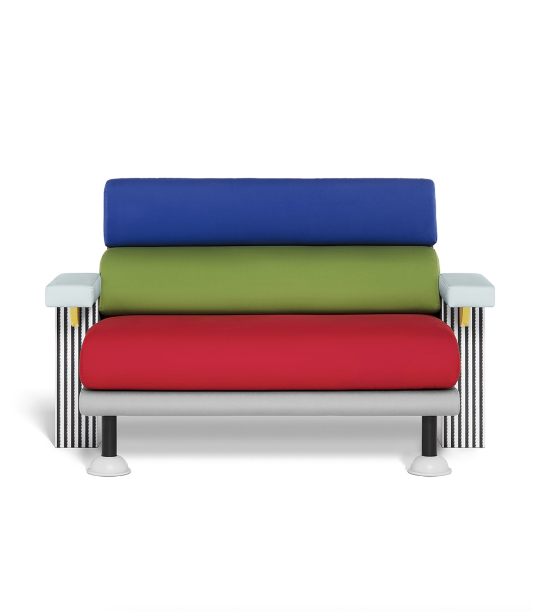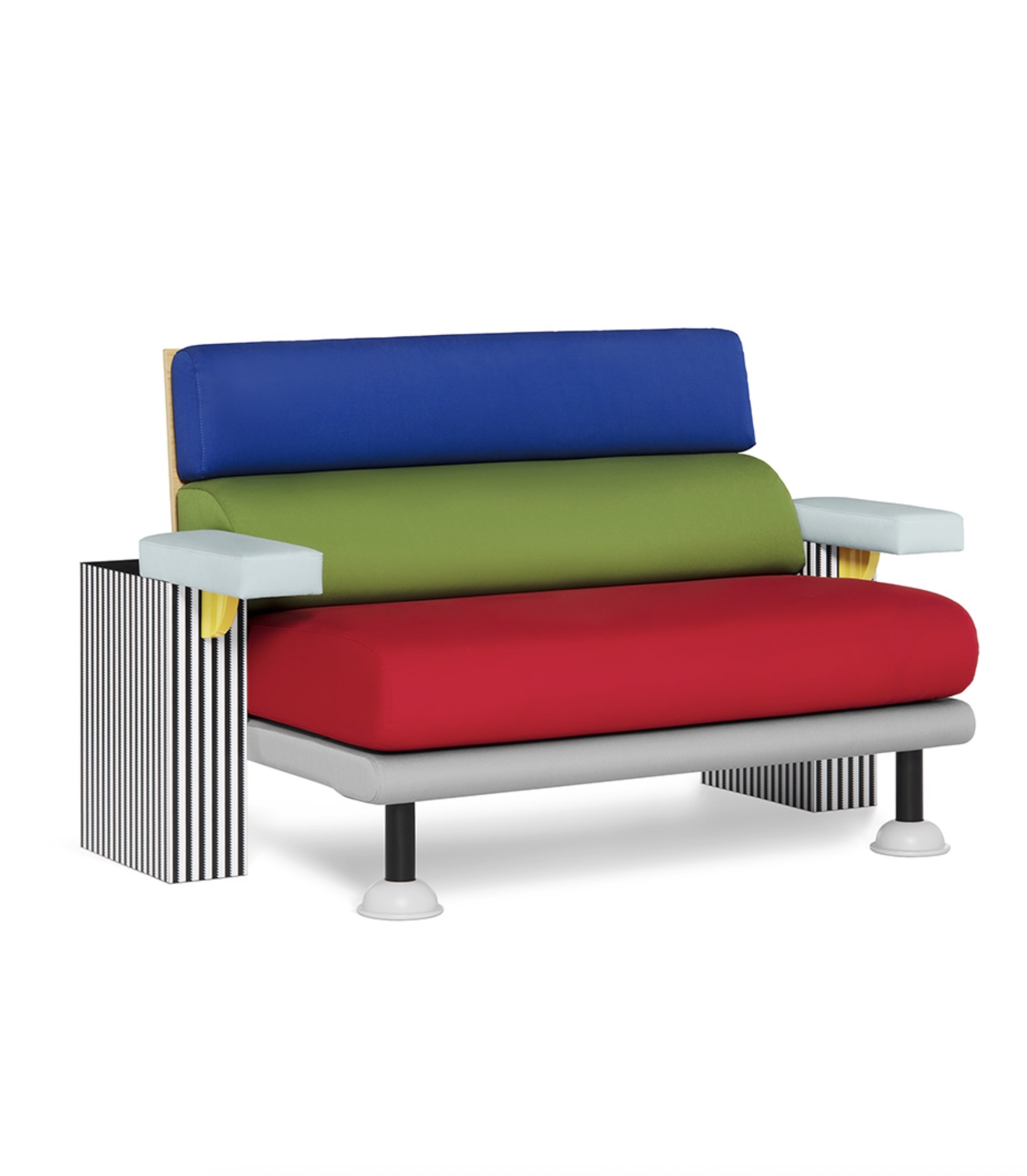 Lido by Michele De Lucchi is a sofa that's both eccentric and elegant. The juxtaposition of shapes and volumes plays with the overlapping, interlocking pieces of color, shaping their form. The black and white stripes of the decorative laminate intentionally contrast with the shapes and colors of the seat, backrest, and armrests, made with padding covered in fine fabric.