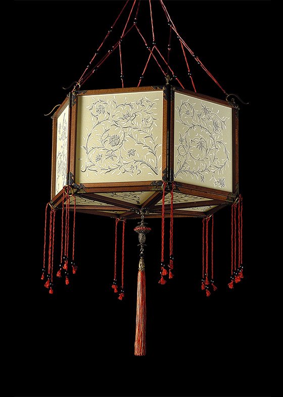 The Fortuny® Concubine Loto, or lotus concubine, has a simple structure that evokes the purity of that flower. It features the Oriental aesthetic that enthralled Mariano Fortuny. The wood structure protects the silk and enhances its silvery patterns. Hang this lamp individually or in a composition to achieve soft lighting that adds refinement to any décor.