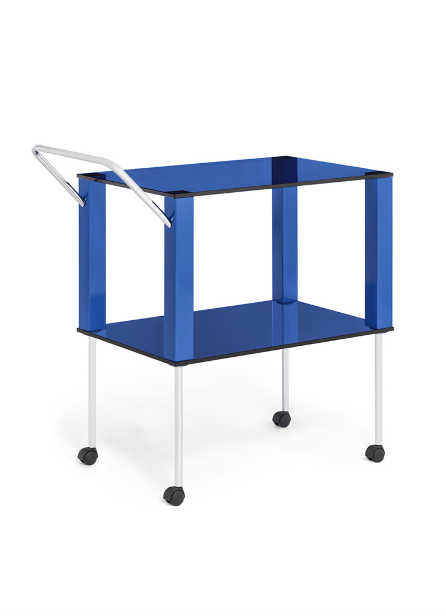 Manhattan by Ettore Sottsass stands out for its vertical and horizontal lines that intersect to create a dynamic, angular composition, referencing the modern skyscrapers of the Big Apple. Trolley or stand? Both, neither. The design adapts to various applications: from a handy side table to a presence to divide a space.