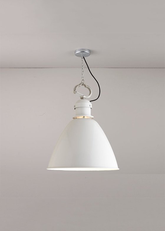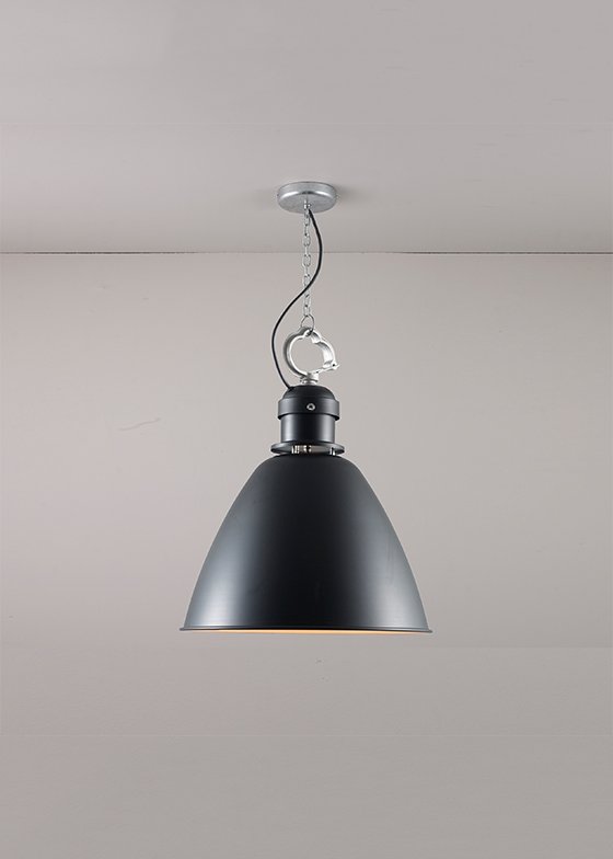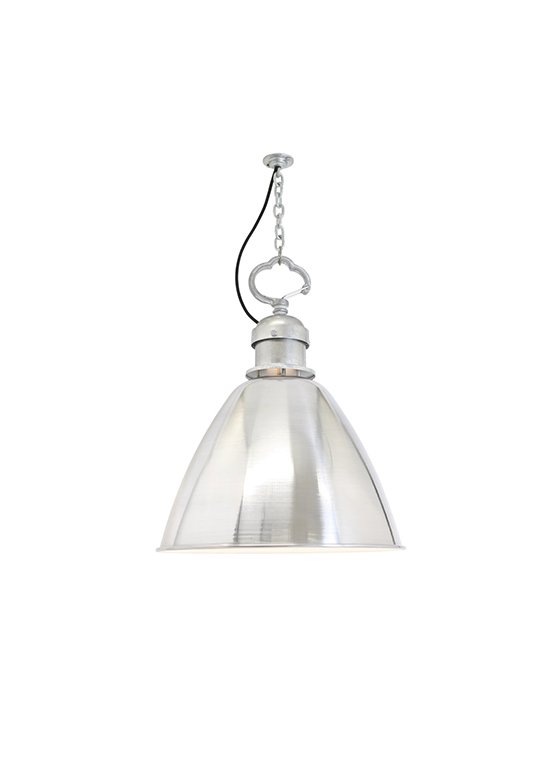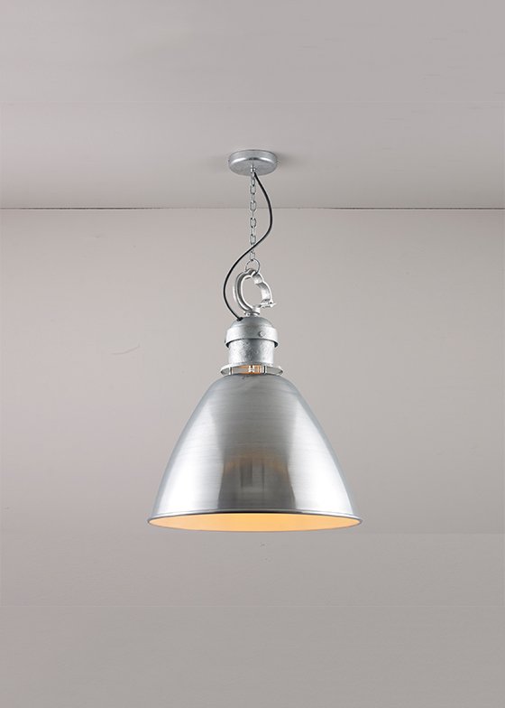 An industrial style pendant light with galvanized hardware and a hooked handle. Available in 3 sizes and a choice of polished aluminum, painted black or putty grey.