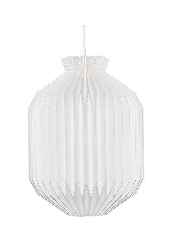 In 1945 Mogens Koch simplified the myriad of cross-pleats in Kaare Klint's Fruit lamp to create this more stringent lampshade design. The oval shape gives the lamp a more sedate expression, closely allied to traditional Japanese paper lamps. The enclosed shape makes it suitable for hanging from a high ceiling. This item is only available to special order. Please allow for a short delivery delay.