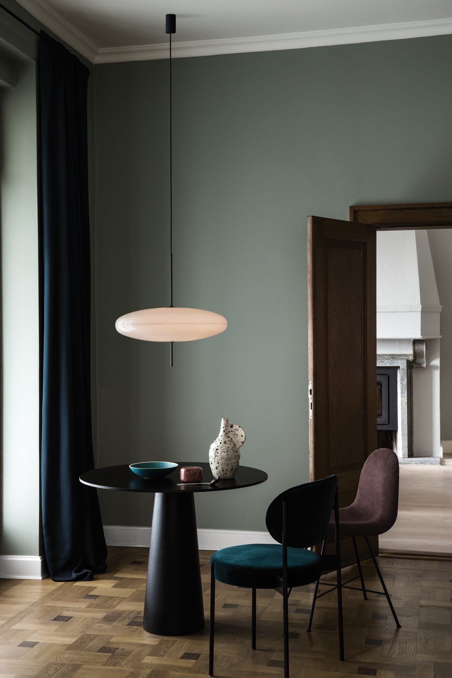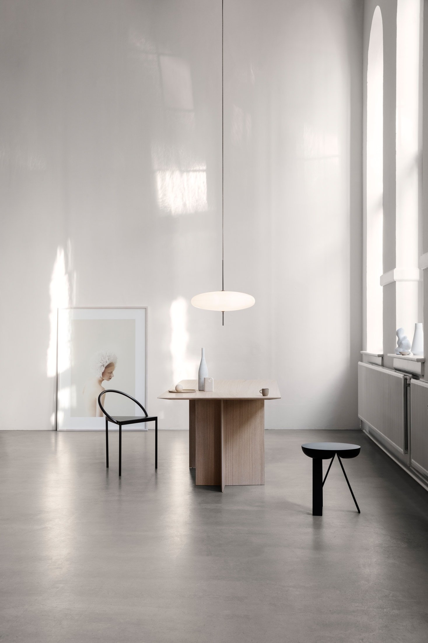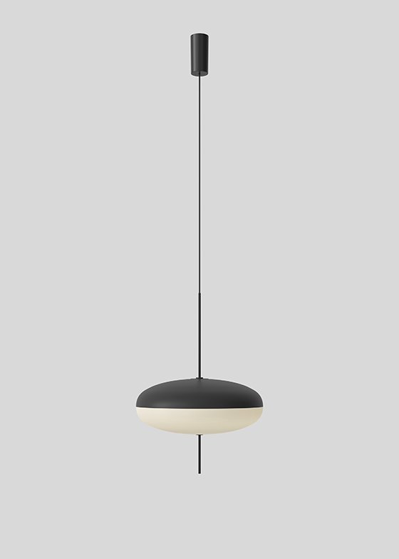 The 2065 is made of two joined opaline methacrylate saucer-shaped diffusers suspended from the ceiling with a black painted aluminum canopy. The simplicity of the design and lightness of the materials makes for an elegant and free-floating luminaire. The all-white diffuser comes with black hardware and a choice of a black or white cord, while the black and white diffuser comes with black hardware and cable.