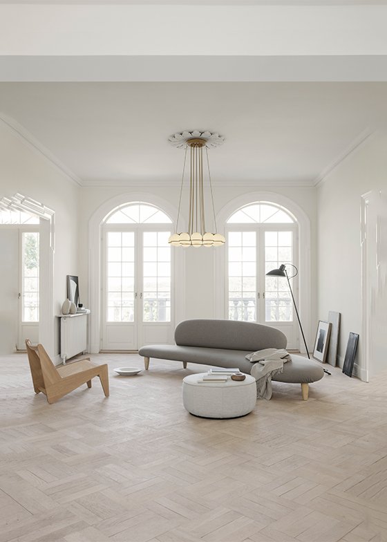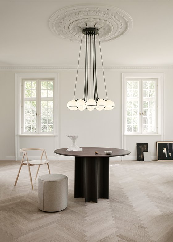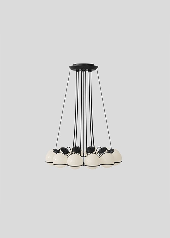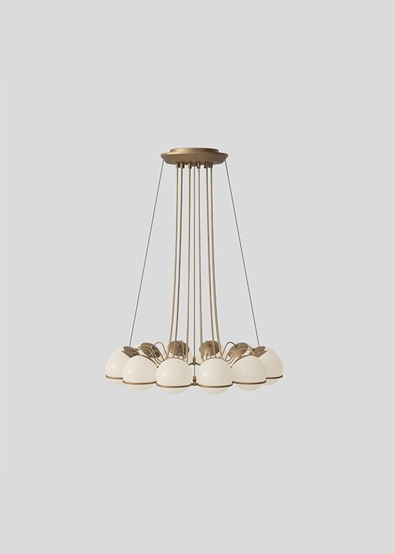 Throughout his life, Gino Sarfatti has always been fascinated by the sky, especially by the perfect light emanating from the moon. Le Sfere is a testament to this special attraction of his. Conceived from 1959, it is a family of opal glass lamps, the largest designed by the master, which includes a single sphere model up to a composition of twenty-four arranged in a circular manner to form a chandelier. Each blown opal glass sphere is held in place by a painted steel ring that embraces it and helps to define its refined aesthetics. From Model 237, consisting of a single sphere, to Model 2109, that of the iconic chandelier, Le Sfere is a family that has grown over the years also used on interior projects curated by Gino Sarfatti, for example at the Teatro di Regio di Torino designed by the architect Carlo Mollino, where they can still be admired in a variety of compositions. But, above all, it is a multifaceted and open lighting system, suitable for all types of spaces.