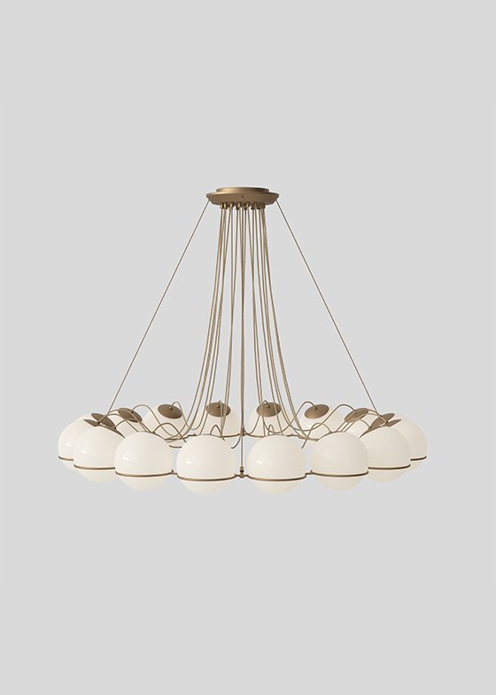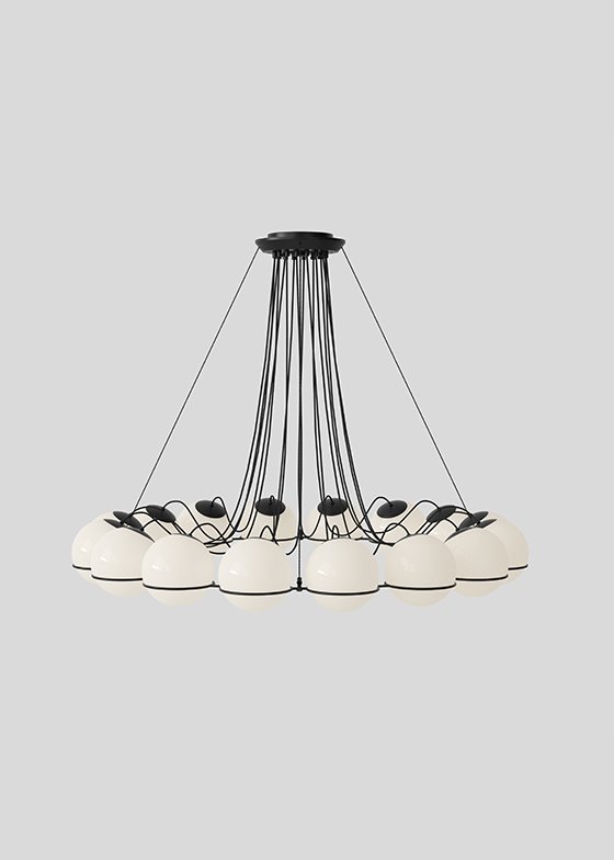 Throughout his life, Gino Sarfatti has always been fascinated by the sky, especially by the perfect light emanating from the moon. Le Sfere is a testament to this special attraction of his. Conceived from 1959, it is a family of opal glass lamps, the largest designed by the master, which includes a single sphere model up to a composition of twenty-four arranged in a circular manner to form a chandelier. Each blown opal glass sphere is held in place by a painted steel ring that embraces it and helps to define its refined aesthetics. From Model 237, consisting of a single sphere, to Model 2109, that of the iconic chandelier, Le Sfere is a family that has grown over the years also used on interior projects curated by Gino Sarfatti, for example at the Teatro di Regio di Torino designed by the architect Carlo Mollino, where they can still be admired in a variety of compositions. But, above all, it is a multifaceted and open lighting system, suitable for all types of spaces.