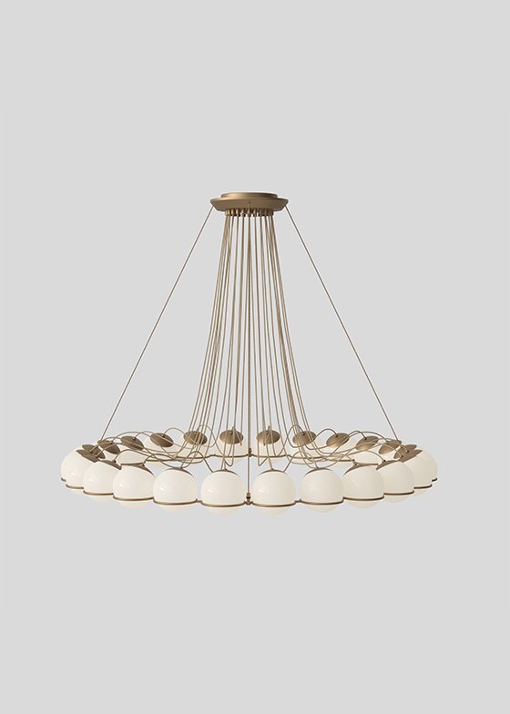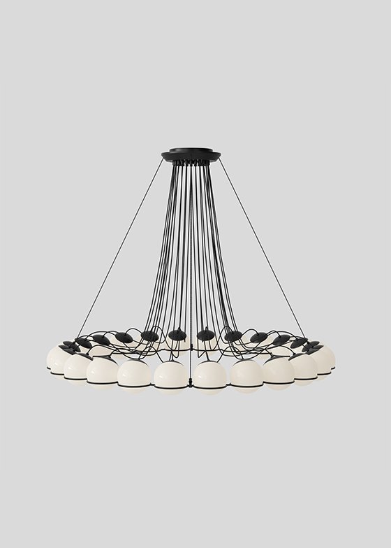 Throughout his life, Gino Sarfatti has always been fascinated by the sky, especially by the perfect light emanating from the moon. Le Sfere is a testament to this special attraction of his. Conceived from 1959, it is a family of opal glass lamps, the largest designed by the master, which includes a single sphere model up to a composition of twenty-four arranged in a circular manner to form a chandelier. Each blown opal glass sphere is held in place by a painted steel ring that embraces it and helps to define its refined aesthetics. From Model 237, consisting of a single sphere, to Model 2109, that of the iconic chandelier, Le Sfere is a family that has grown over the years also used on interior projects curated by Gino Sarfatti, for example at the Teatro di Regio di Torino designed by the architect Carlo Mollino, where they can still be admired in a variety of compositions. But, above all, it is a multifaceted and open lighting system, suitable for all types of spaces.