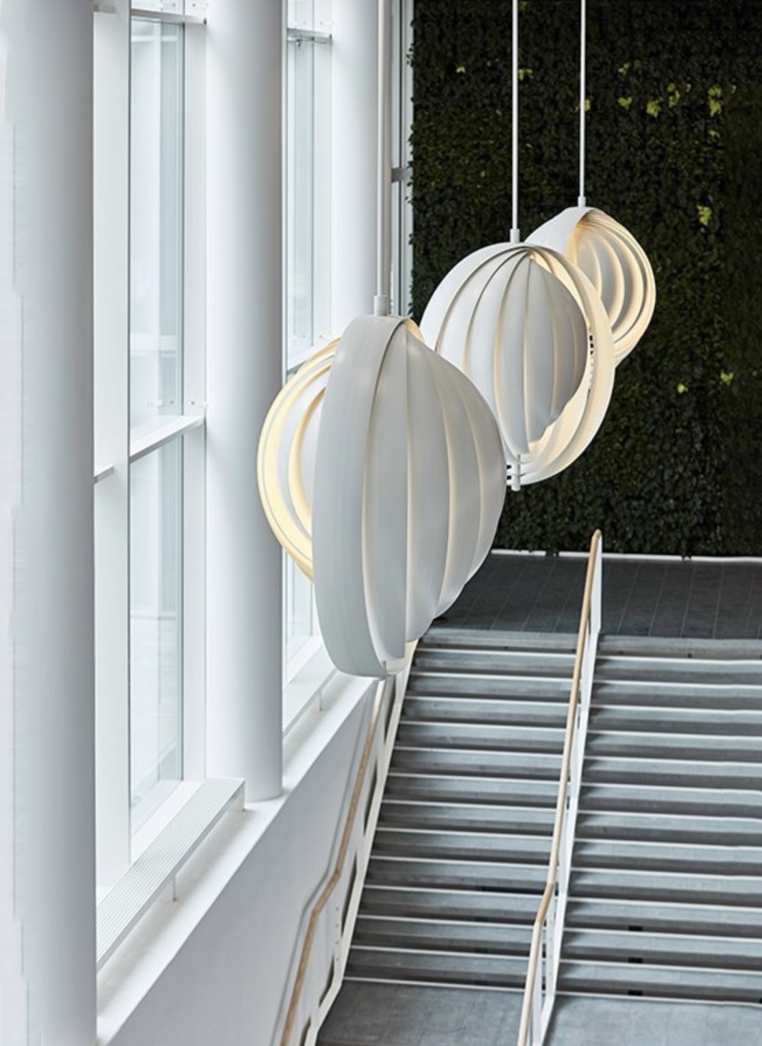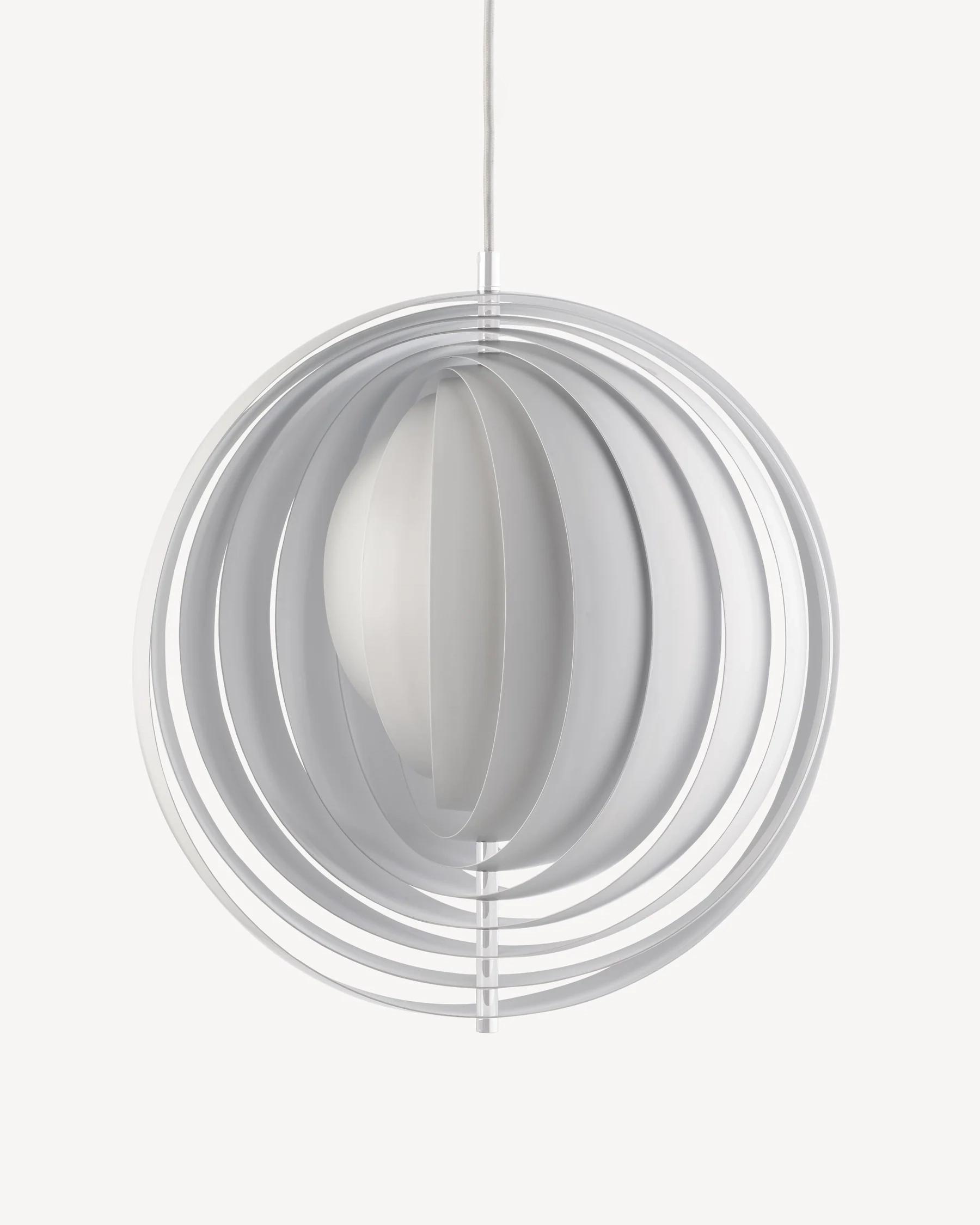 Designed in 1960, the Moon represents one of Verner Panton’s earliest designs in lighting. The iconic pendant is characterized by its fan-like design with ten ring-shaped lamellae perfectly positioned to provide a soft, ambient and glare-free light. The blades reflect and filters the light and the pendant changes its appearance depending on the angle at which you view it.