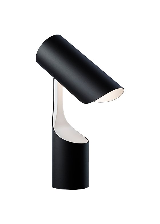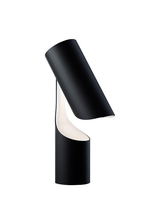 This design inspired by transformation and minimalistic geometry, discreetly has the on/off switch attached to the cord, allowing this beautiful matt black table lamp to stand freely in its cylinder form while engaging it’s user into an experience when the black exterior is lifted to reveal light and a complimentary contrasting glossy white interior.