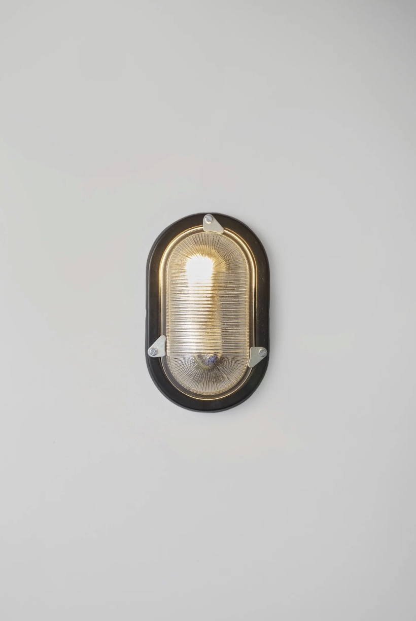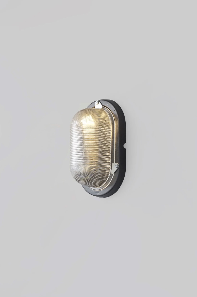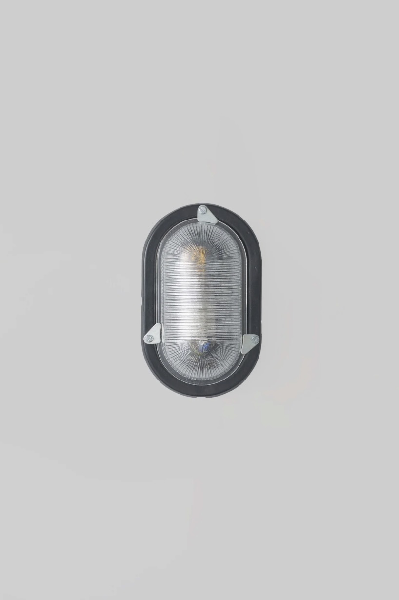 Traditional oval cast aluminium utility bulkhead with grey hammerite paint finish and clear prismatic glass. Rear conduit entry through backplate fixing.