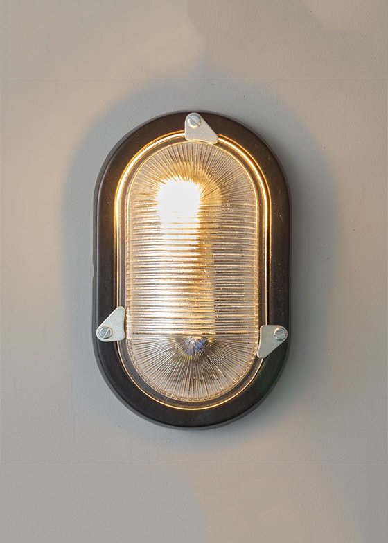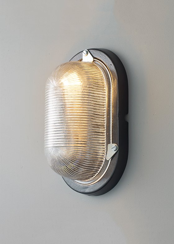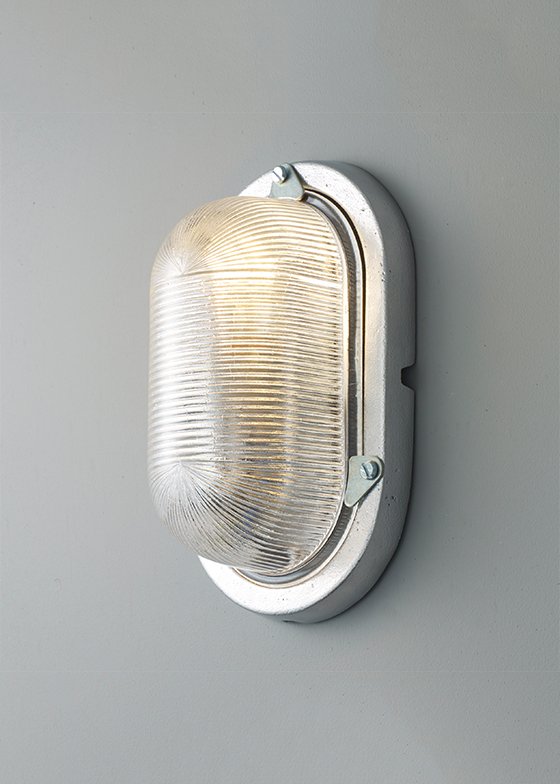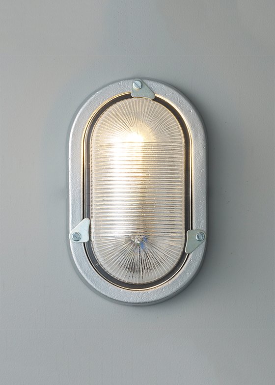 Traditional oval cast aluminium utility bulkhead with grey hammerite paint finish and clear prismatic glass. Rear conduit entry through backplate fixing.