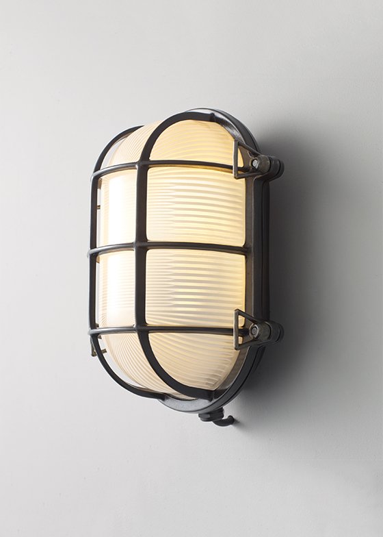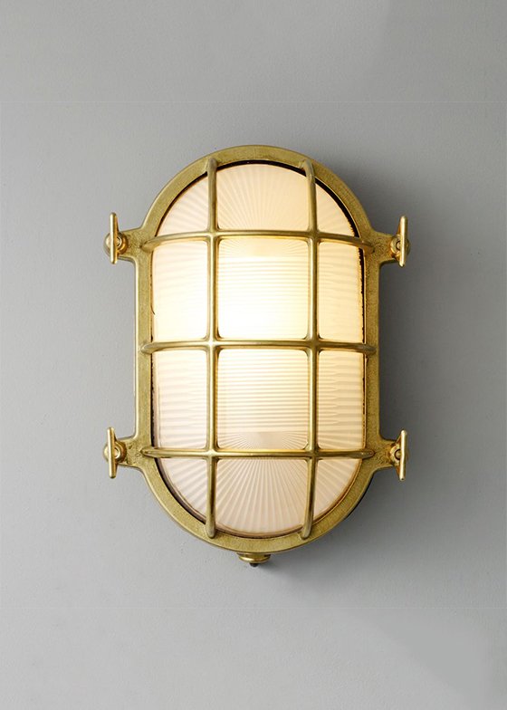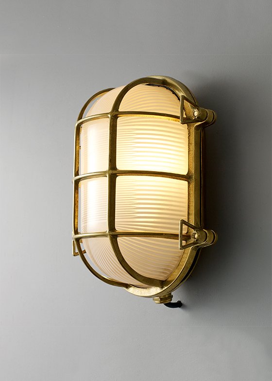 A traditional die-cast brass bulkhead light with frosted, prismatic glass diffusers from Davey's original catalogue. Available in three different finishes - natural brass (unlacquered), weathered brass and chrome plated - and three sizes. Front guards secured by four wing nuts. Glanded surface cable entry.