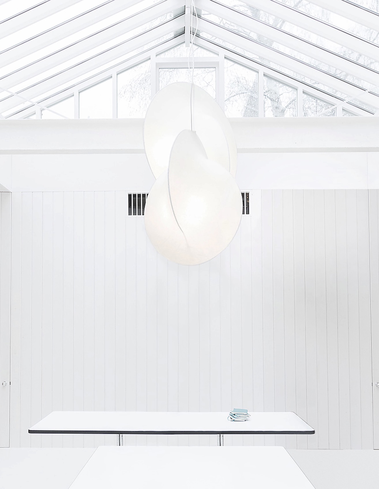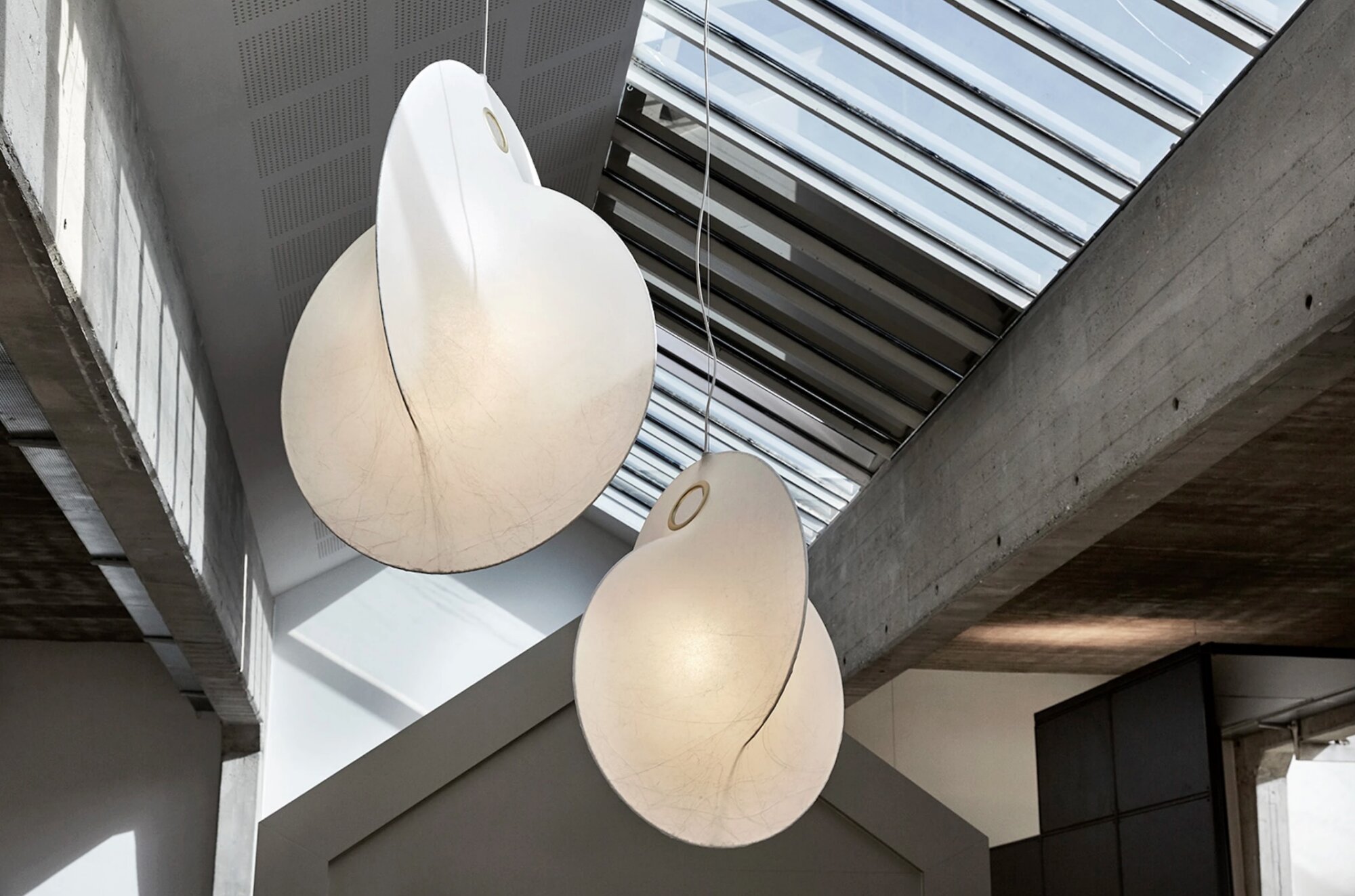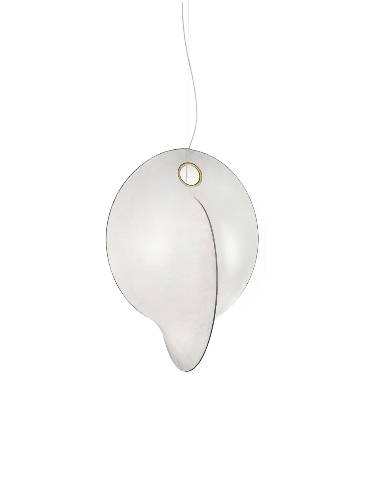Suspended lamp with diffused light. Internal structure in white powder painted steel. Resin diffuser cocoon sprayed on the structure.