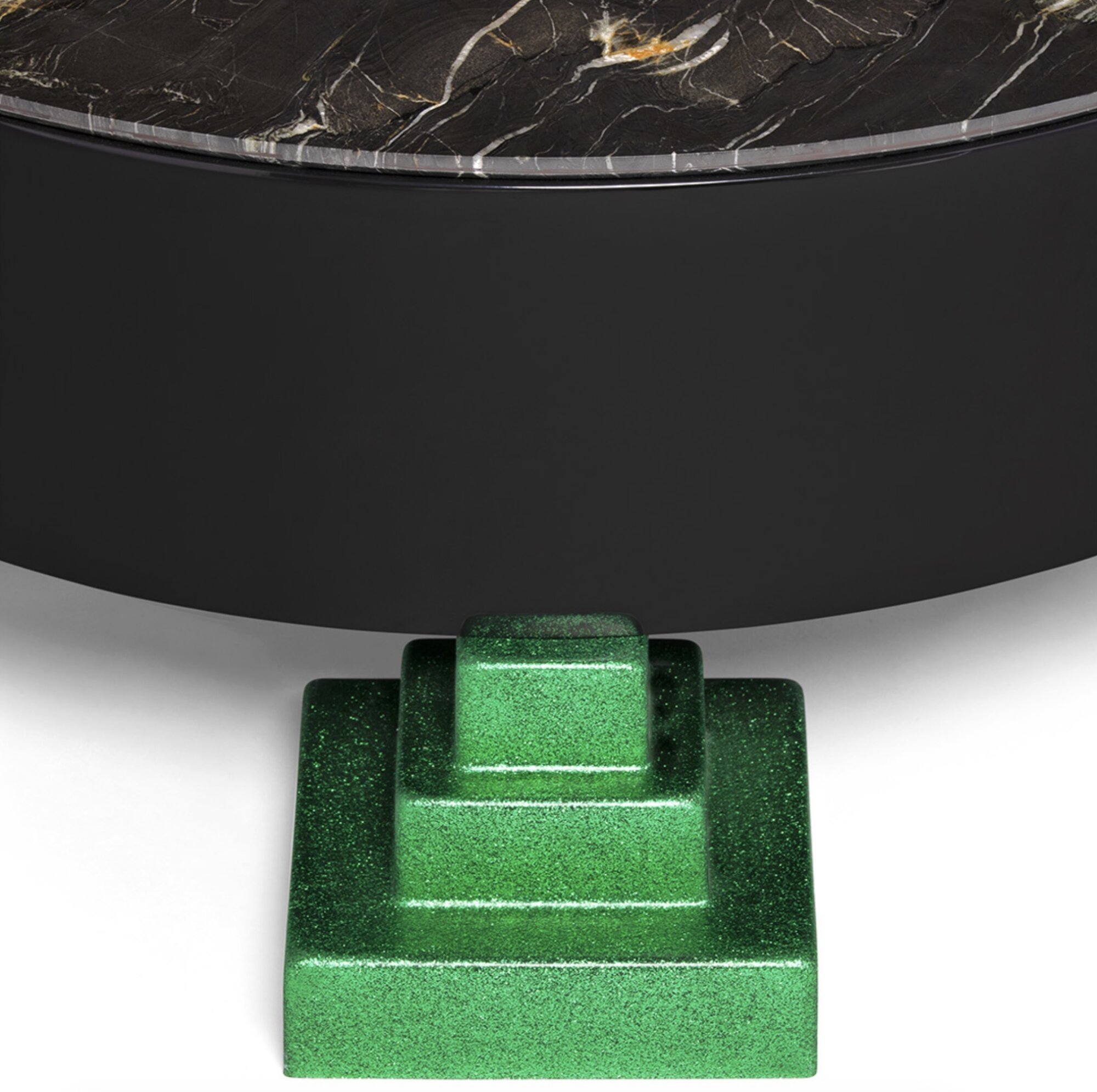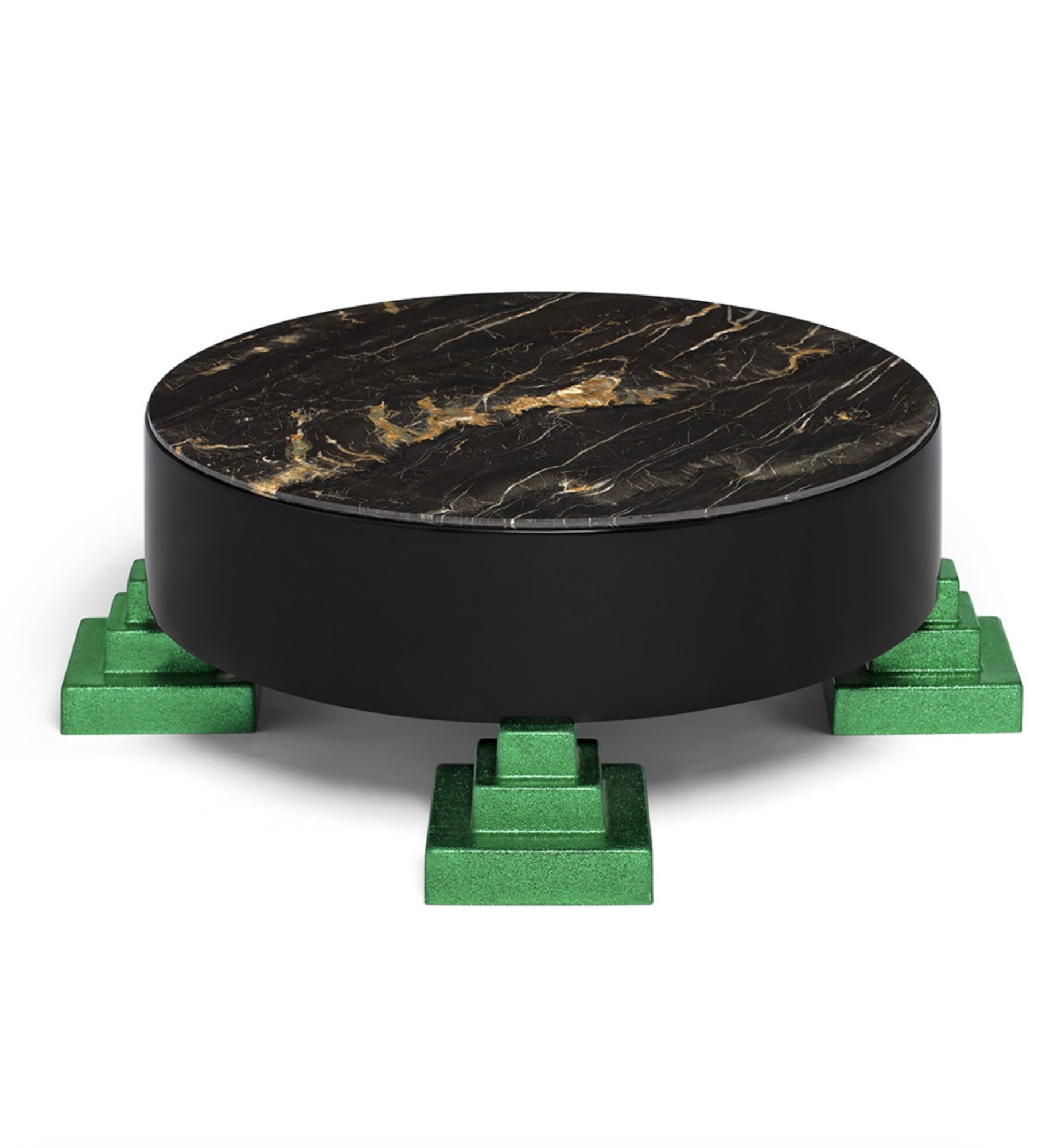 Park Lane overturns Loos's rationalist concept that "ornament is crime": Ettore Sottsass reclaims the value of decoration by emphasizing the structural function of pedestals with aesthetics. The table's iconic nature is given by the iridescent "feet" that raise it from the ground like small ziggurats, making it imposing and precious.