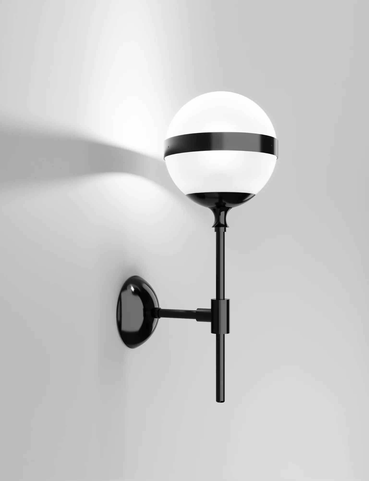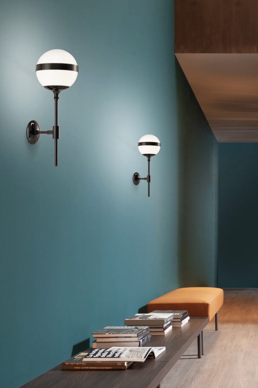 White and black. Peggy was created starting from this chromatic and material polarity. This lighting design combines the lightness of glossy white blown glass, entirely handmade, with the liveliest character of the glossy metal black or antique brass. This effective combination conveys rationality and elegance at the same time.